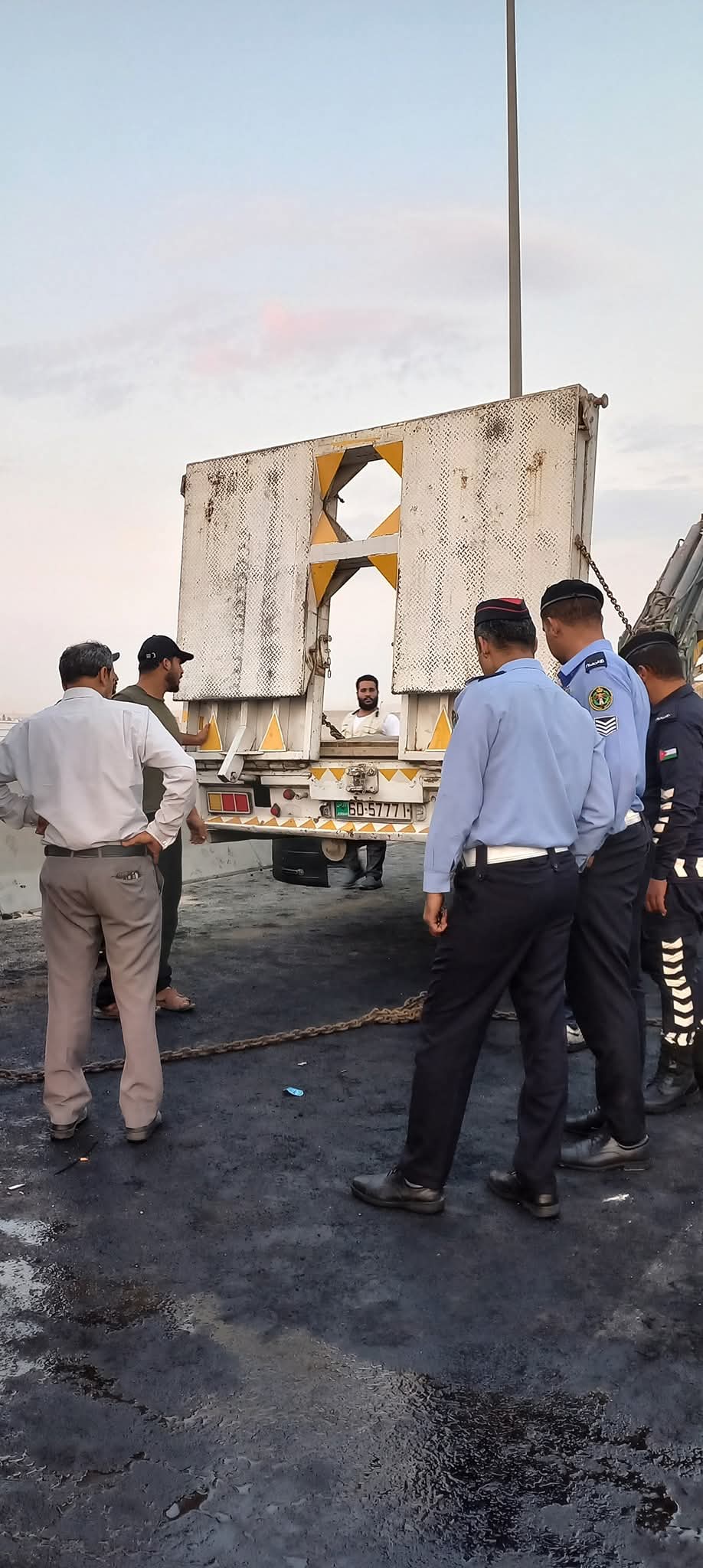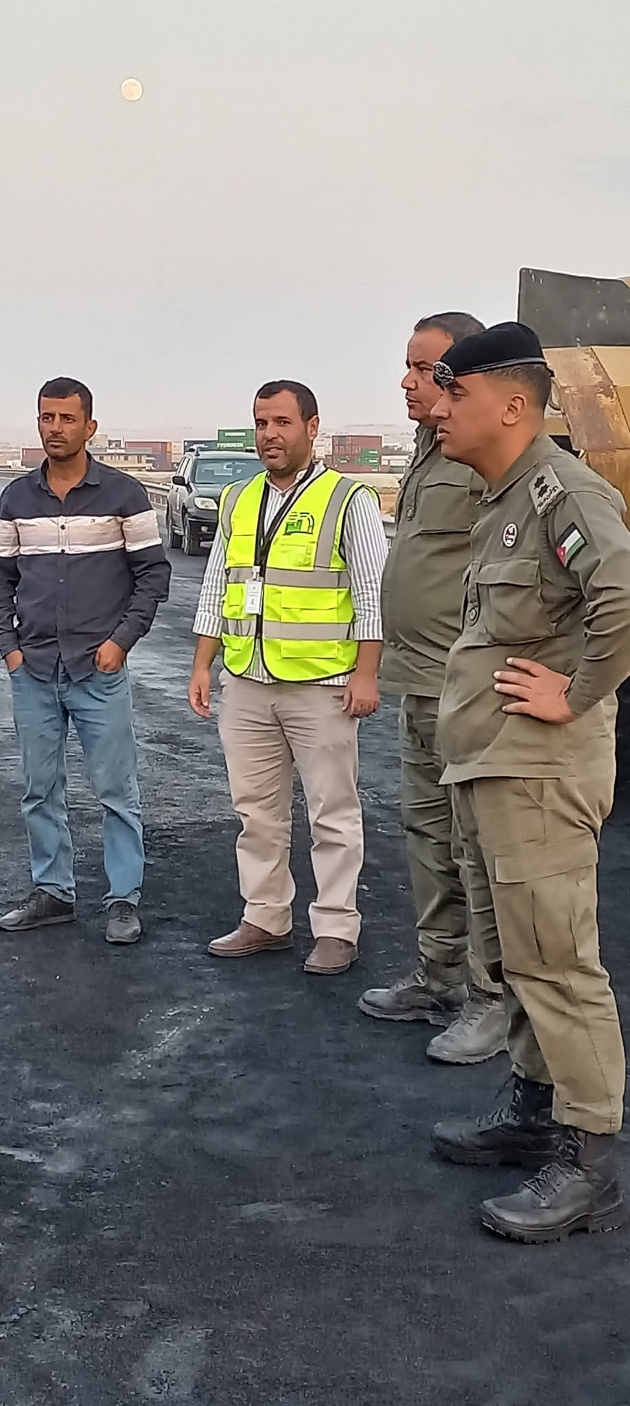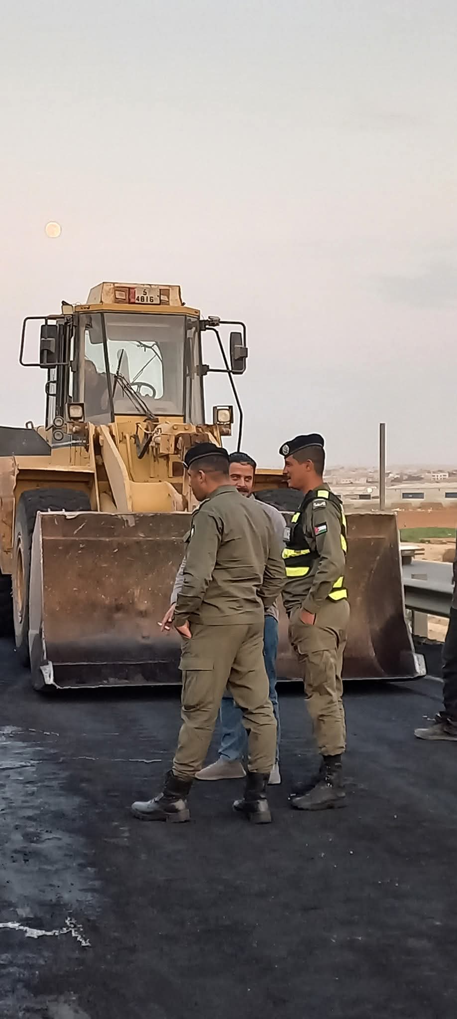 لا تزال كوادر الأمن العام – مركز أمن الموقر بالتعاون مع مكتب أشغال الموقر، وبلدية قضاء رجم الشامي، وبلدية لواء الموقر، تعمل على معالجة آثار الحادث على طريق المِيّة، والذي أدى إلى إغلاق المسرب القادم من جسر الذهيبة الغربية باتجاه الموقر بسبب التصادم.