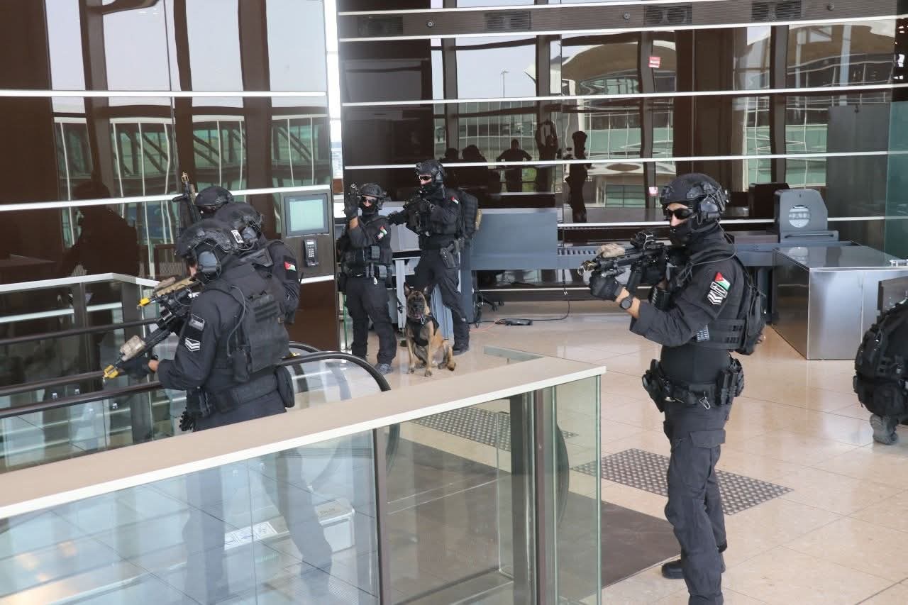 نفذت مديرية أمن وحماية المطارات، اليوم الثلاثاء، تمريناً أمنياً ميدانياً تحت مسمى "درع المطار"، بمشاركة الكتيبة الخاصة/٧١ وعدد من الأجهزة الأمنية العاملة في مطار الملكة علياء الدولي، وبحضور مدير أمن وحماية المطارات.