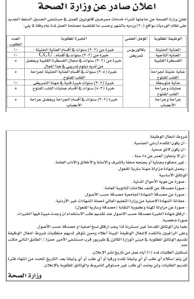 اعلنت وزارة الصحة عن حاجتها لشراء خدمات ممرضين قانونيين للعمل في مستشفى الحسين "السلط الجديد" بواقع 20 وردية بالشهر .