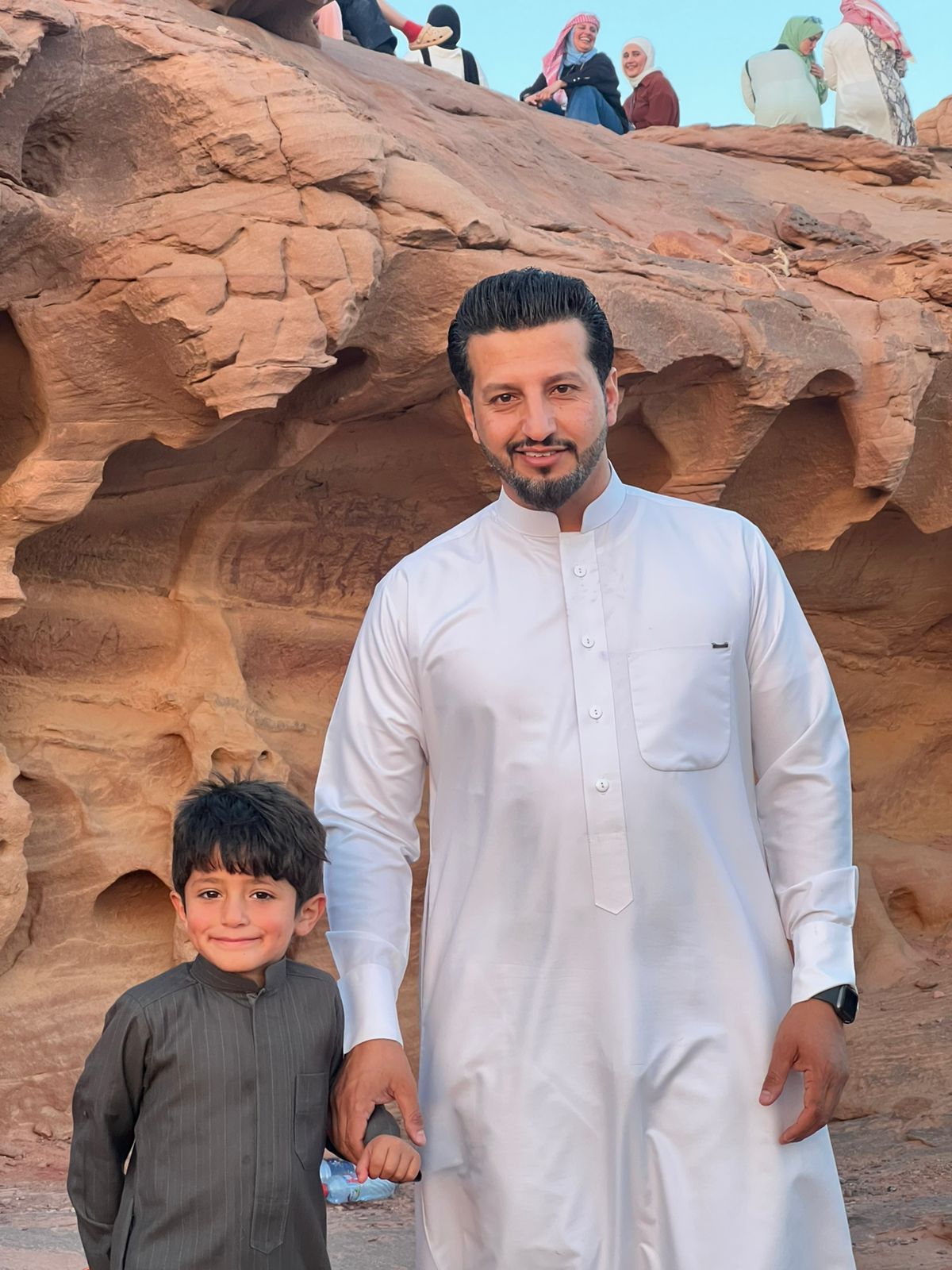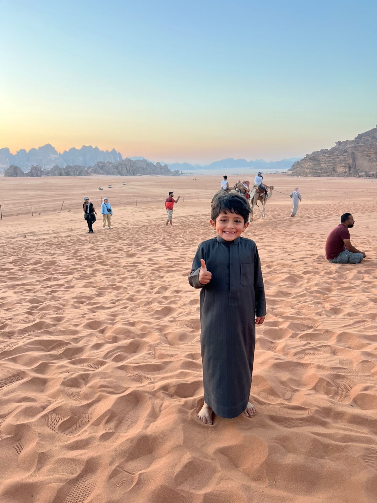 غيم محمد كريم الجحاوشة، طفل لا يشبه أقرانه في حبّه للبرّ والصحراء، إذ يجد في رمالها وهدوئها عالمه الخاص الذي يعكس فطرته النقية وروحه البدوية الأصيلة. منذ سنواته الأولى، تعلّم غيم من بيئته معنى الكرم والضيافة، فكان يستقبل الضيوف بابتسامة كبيرة وعبارات الترحيب التي تفيض صدقاً ودفئاً، وكأنه شاب من أبناء البادية العريقين.