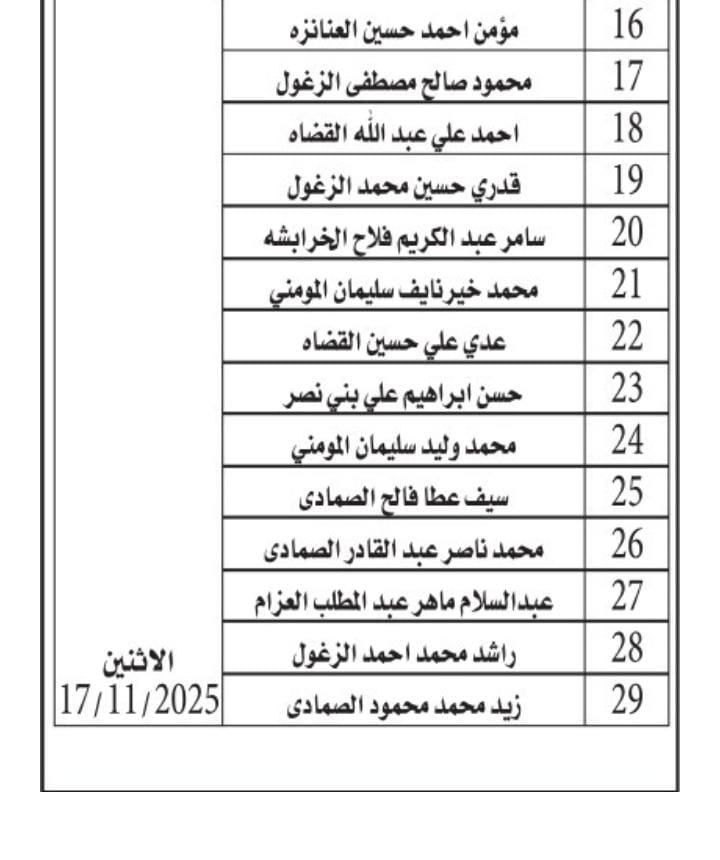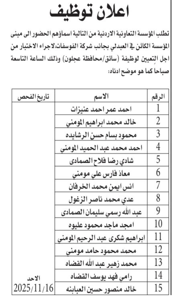 تدعو المؤسسة التعاونية الاردنية، اليوم الاثنين التالية أسماؤهم لحضور الاختبار من أجل التعيين.