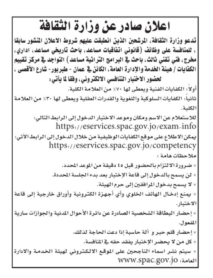 دعت وزارة الثقافة المرشحين الذين انطبقت عليهم شروط الاعلان المنشور سابقا لحضور الامتحان التنافسي.