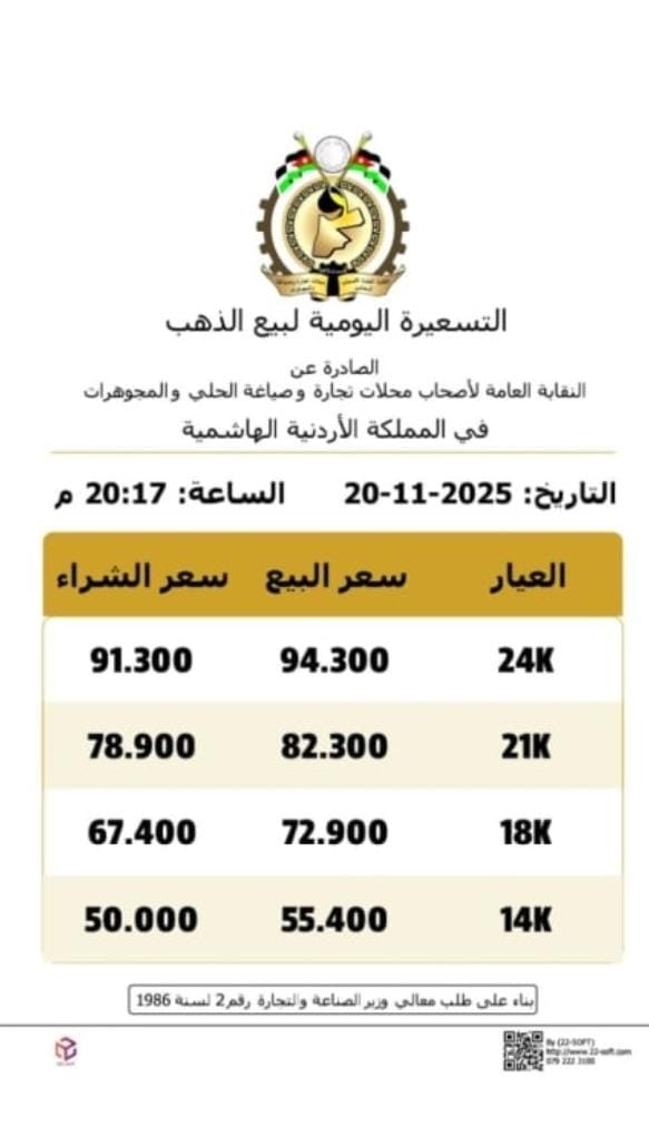 أصدرت النقابة العامة لأصحاب محلات تجارة وصياغة الحلي والمجوهرات، مساء الخميس، تسعيرةً ثالثة للذهب في الأردن اليوم.