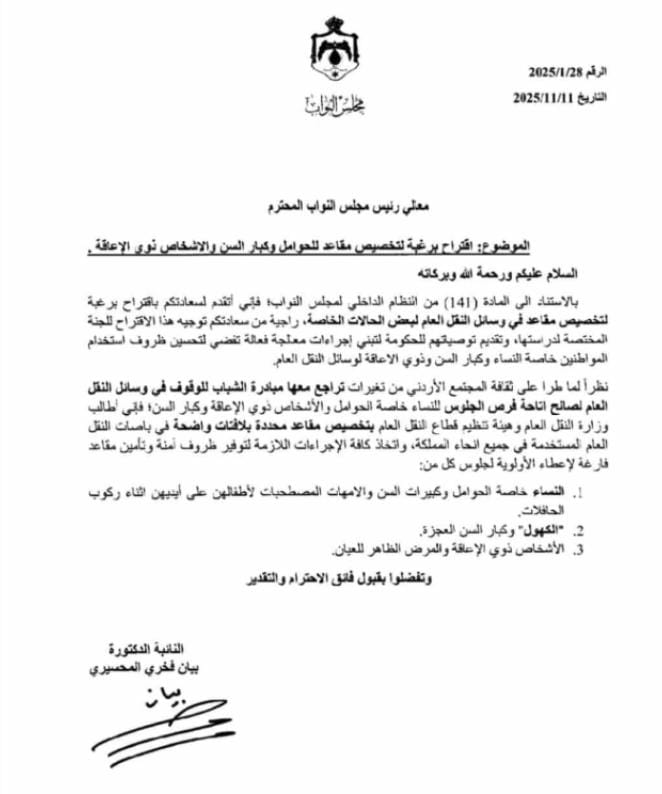 وختمت المحسيري طلبها بدعوة اللجنة المختصة لدراسة المقترح وتقديم توصياتها للحكومة لاتخاذ ما يلزم من إجراءات تُحسّن مستوى الخدمات وتوفّر بيئة نقل أكثر أمانًا واحترامًا لاحتياجات المواطنين