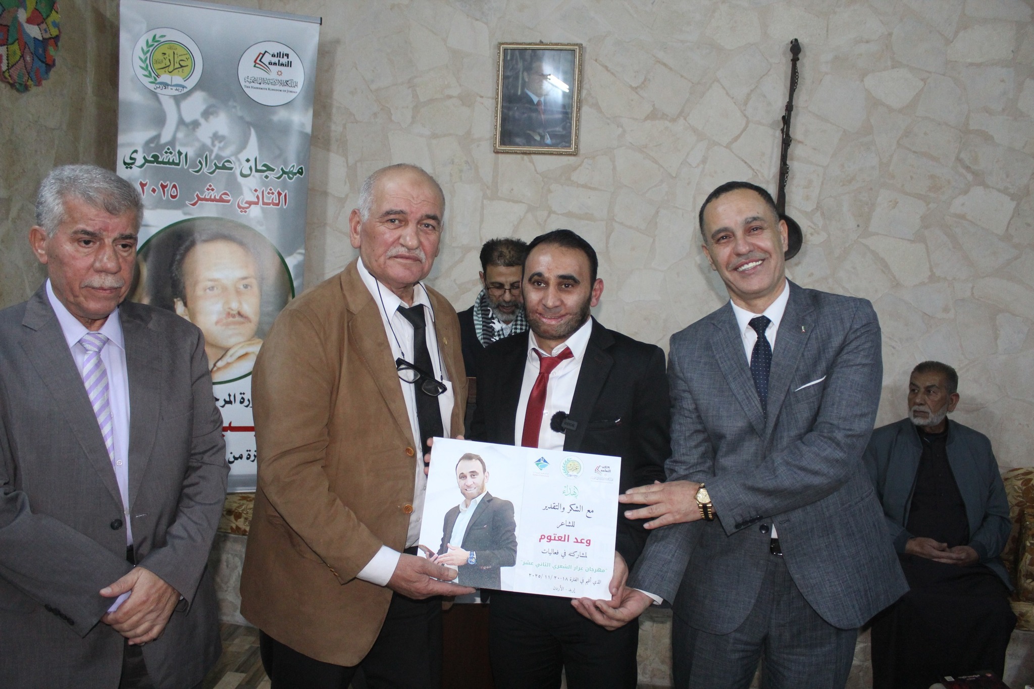 وفي ختام الأمسية، قام رئيس ملتقى عرار الأستاذ محمد خريف، ورئيس ملتقى سحم الثقافي الأستاذ مطر الطوالبة، بتكريم الشعراء بمنحهم دروعاً وشهادات تقدير، في لفتة تعبّر عن الامتنان لجهودهم وحضورهم وإثرائهم للحدث.