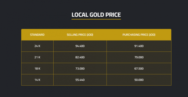أما أسعار بيع الذهب للعيارات الأخرى، فقد سجل سعر غرام عيار (24) في محال الصاغة 94.4 دينارا، في حين بلغ سعر بيع غرام الذهب من عيار (18) 73 دينارا، وعيار (14) بلغ سعره 55.40 دينارا.
