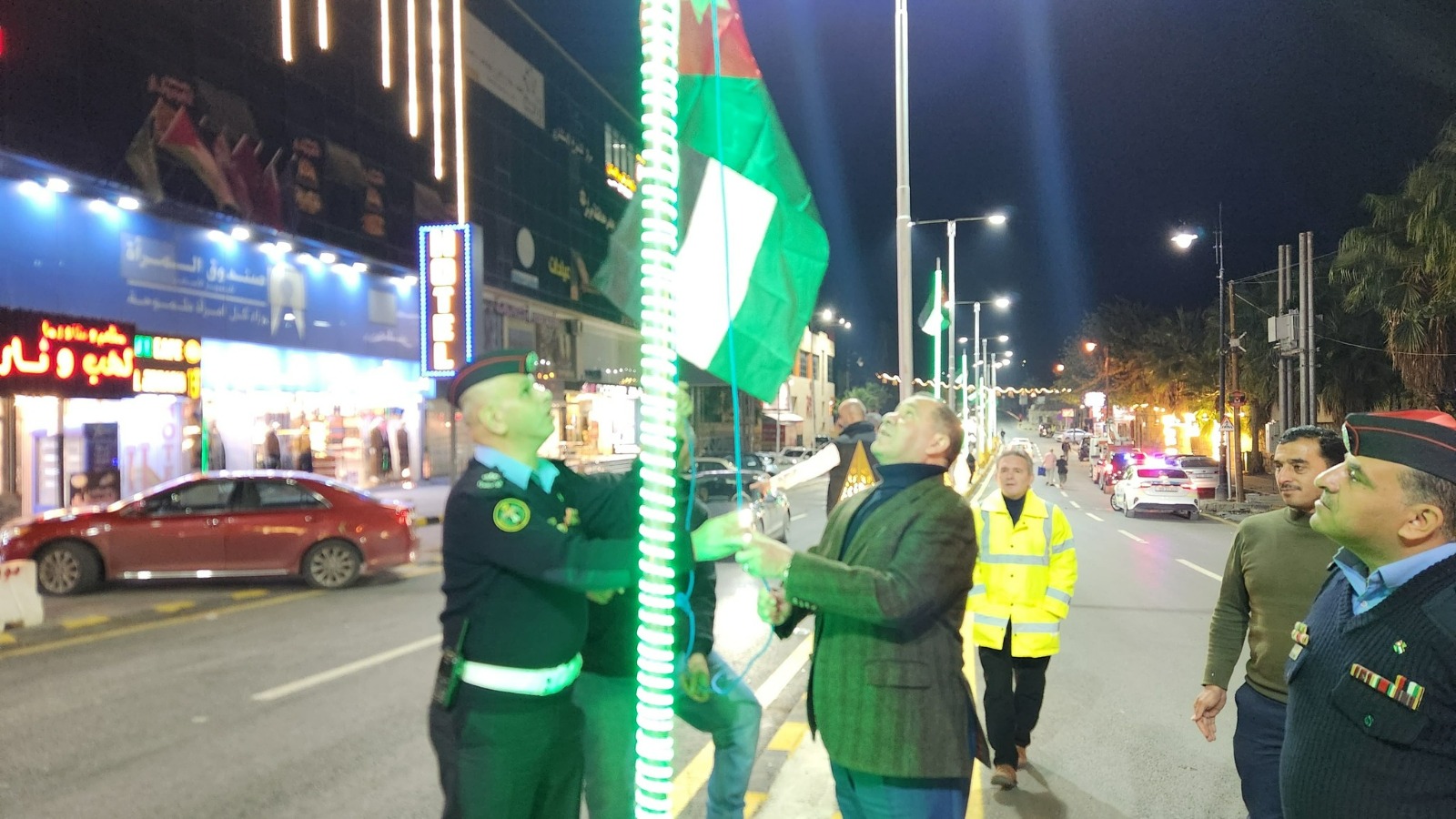 بلدية جرش تضيء مدخل المدينة السياحي وترفع 25 سارية علم أردني