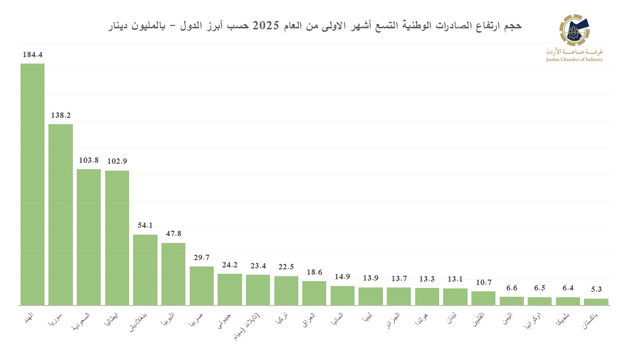 كما أظهرت المعطيات الإحصائية ارتفاعا في الصادرات الصناعية إلى الهند بقيمة 184 مليون دينار لتصل معها خلال التسعة أشهر الماضية من العام الحالي إلى 859 مليون دينار، وكذلك إلى إيطاليا بقيمة 103 ملايين دينار لتبلغ 141 مليون دينار في مؤشر واضح على تنامي الطلب على المنتجات الأردنية بأسواق تقليدية وغير تقليدية.