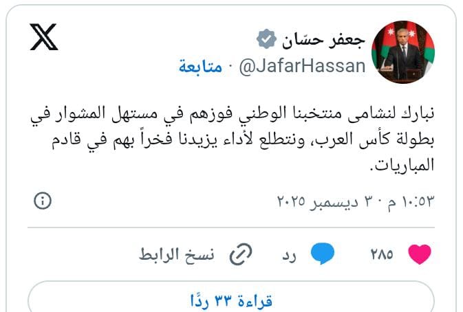 هنأ رئيس الوزراء، الدكتور جعفر حسان، المنتخب الوطني لكرة القدم بفوزه على الإمارات بنتيجة (2-1) ليتصدر المجموعة الثالثة في بطولة كأس العرب فيفا قطر 2025.