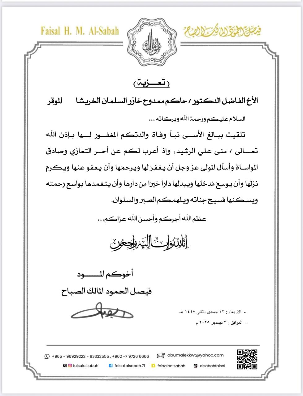 برقية تعزية من الشيخ فيصل الحمود ال الصباح إلى حاكم الخريشا بوفاة والدته
