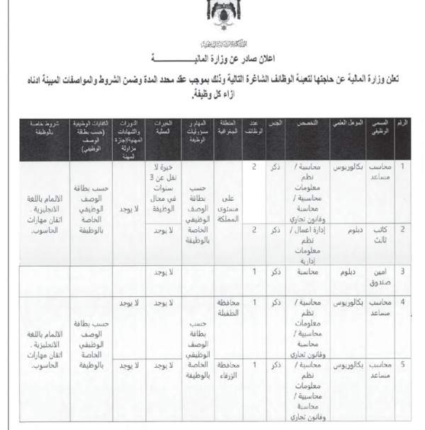 نيروز الإخبارية : نشرت وزارة المالية، إعلانات حول وجود عدد من الوظائف الشاغرة في ملاكها.