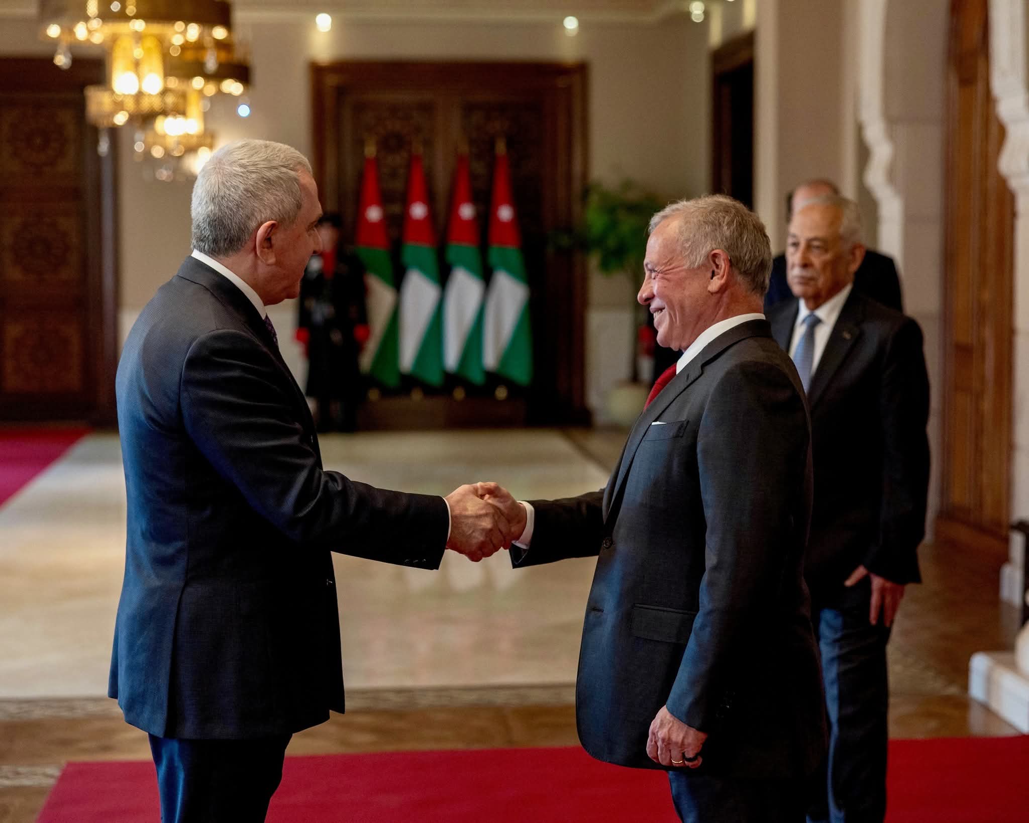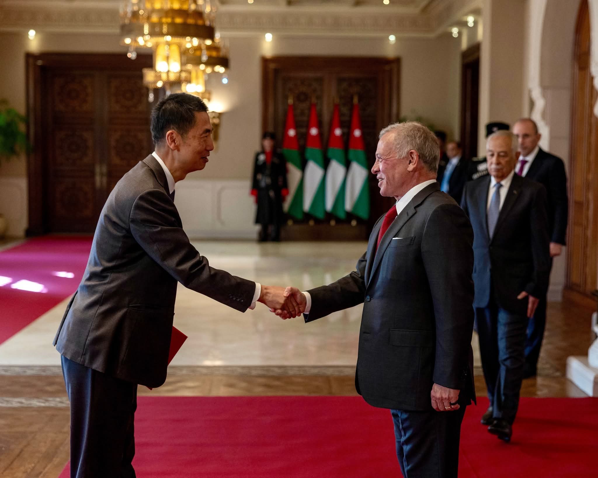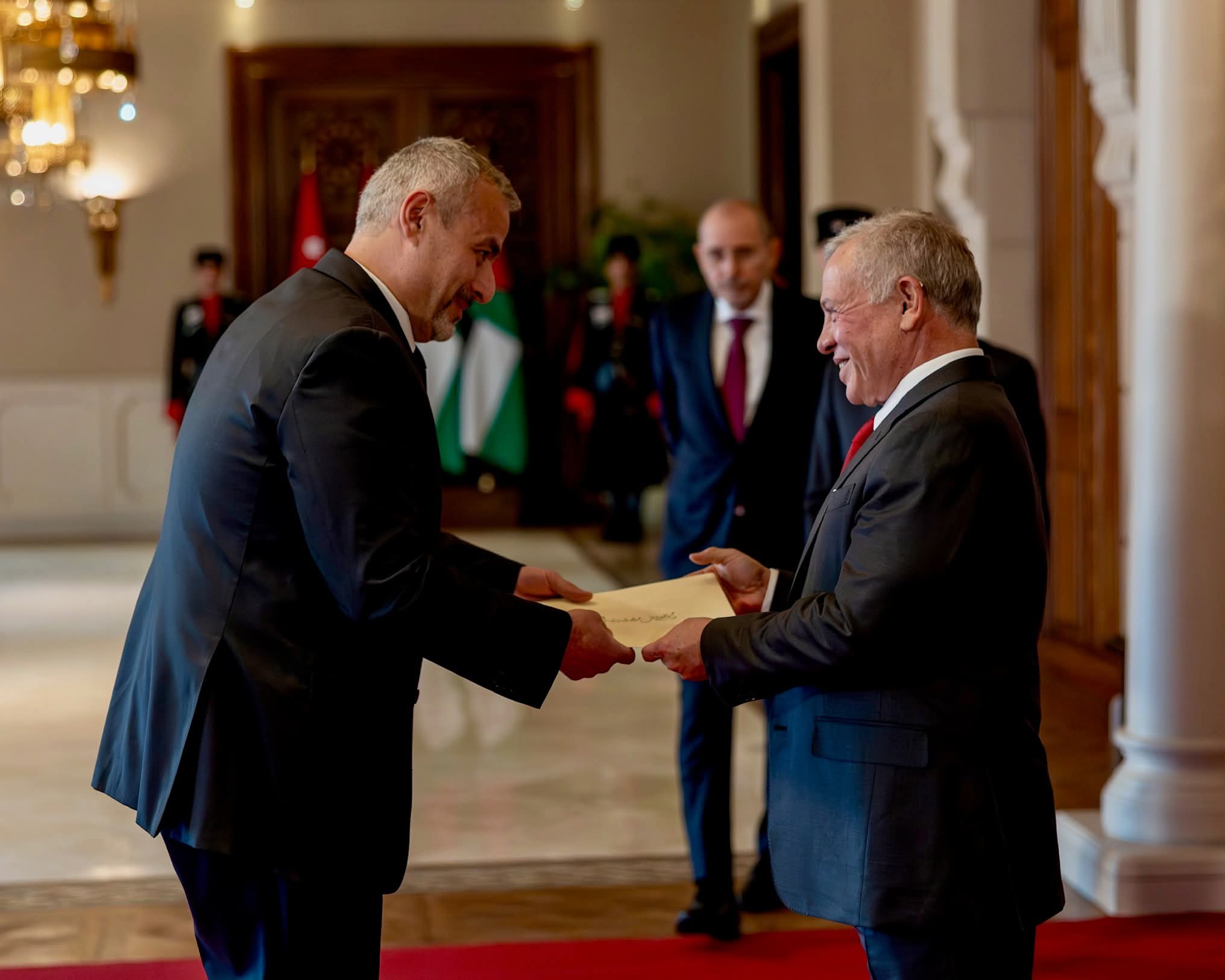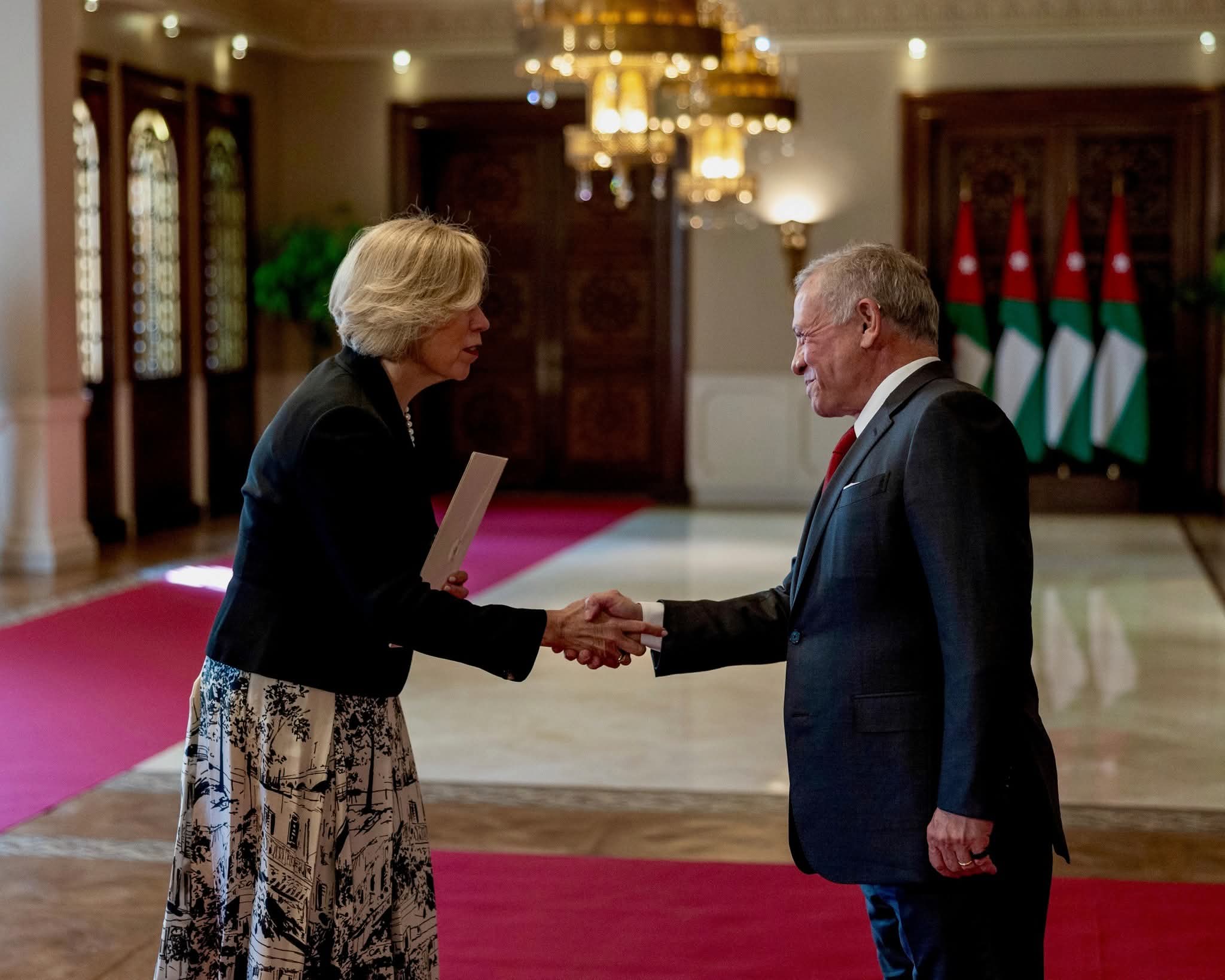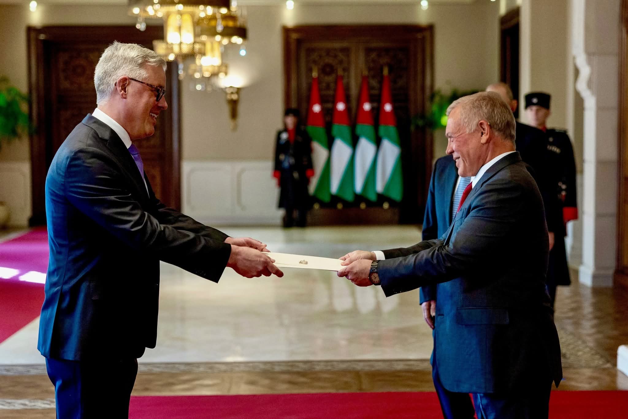 وحضر مراسم تقبل أوراق الاعتماد رئيس الديوان الملكي الهاشمي يوسف حسن العيسوي، ونائب رئيس الوزراء ووزير الخارجية وشؤون المغتربين أيمن الصفدي.