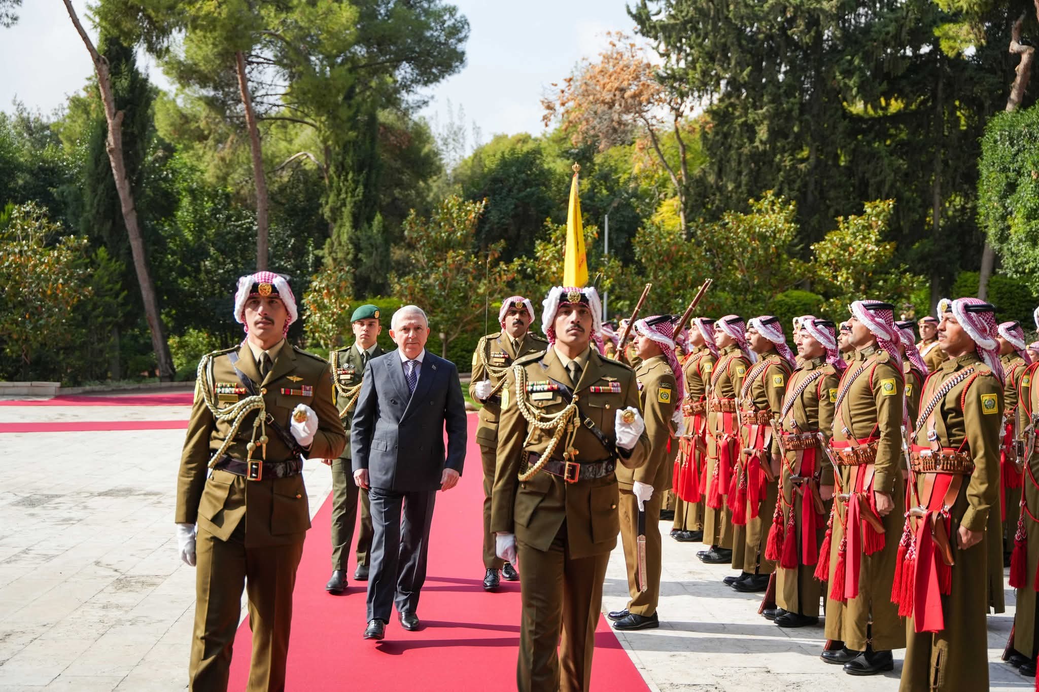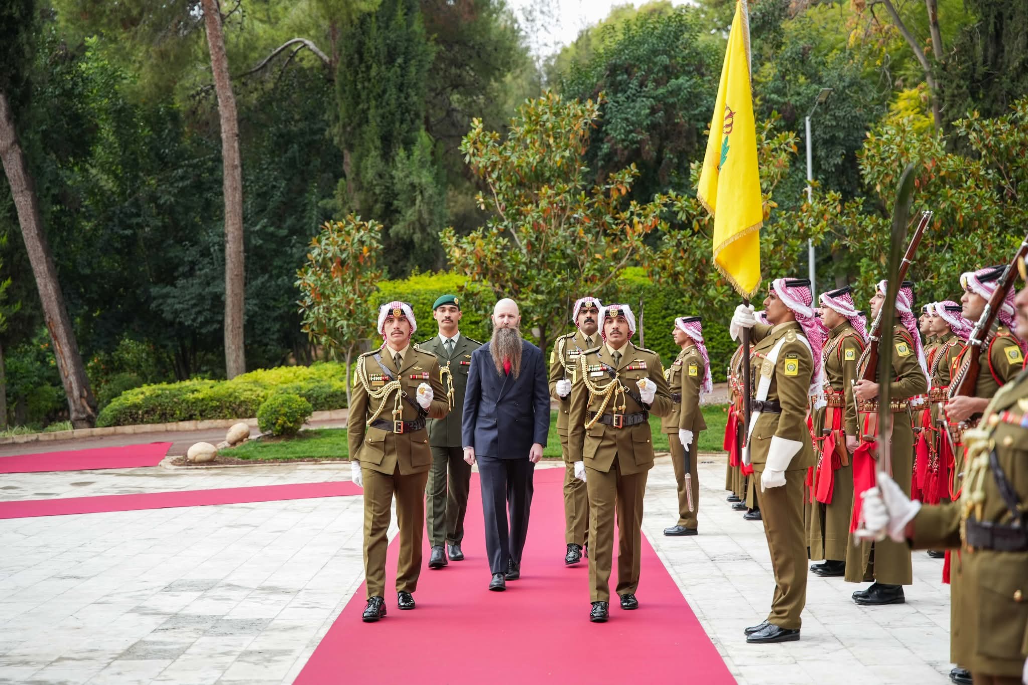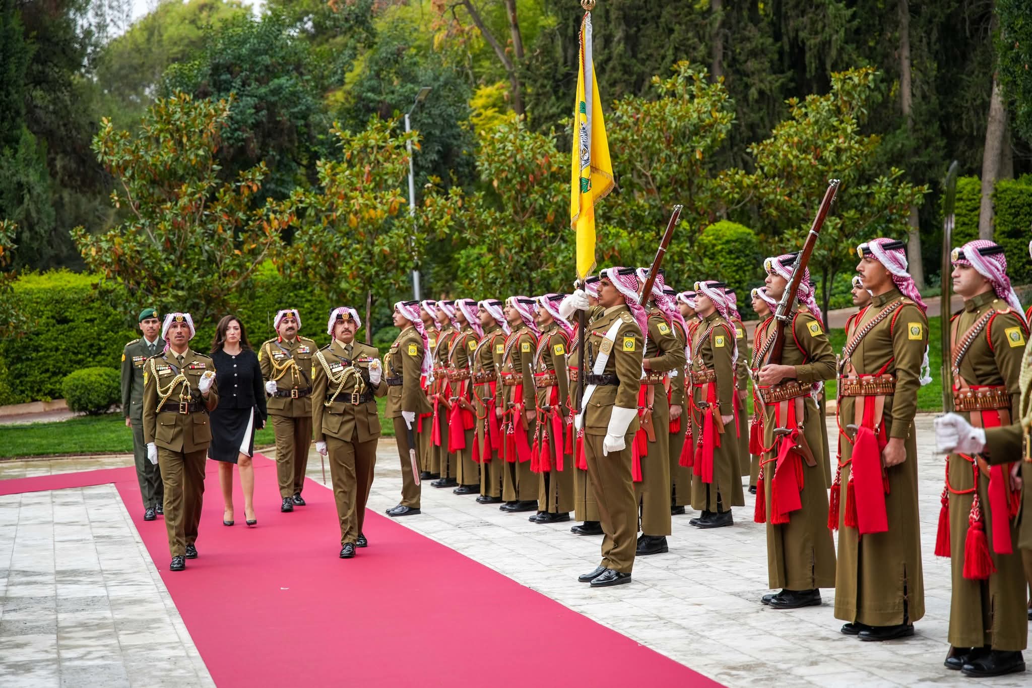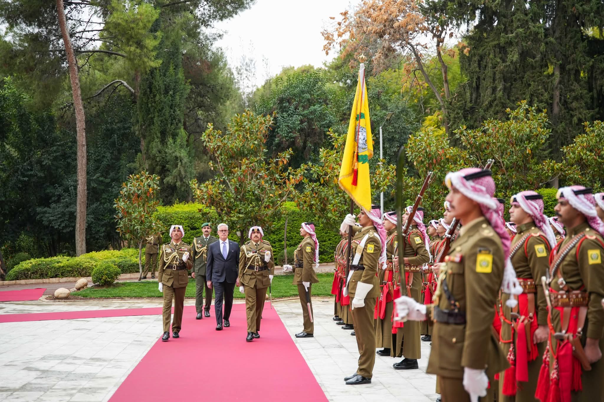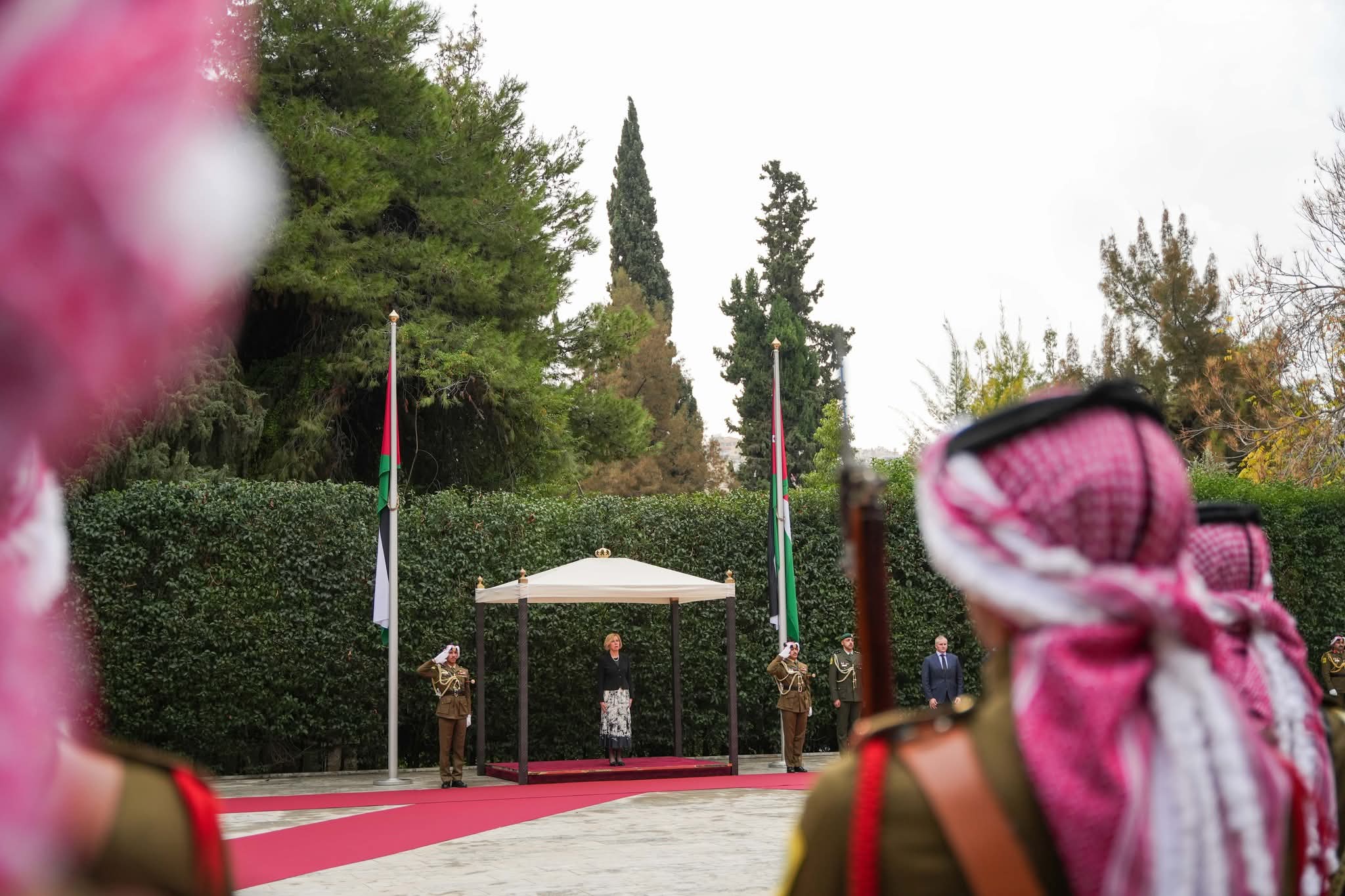 ولدى وصول السفراء قصر بسمان الزاهر عزفت الموسيقى السلام الملكي الأردني والسلام الوطني لبلدانهم.