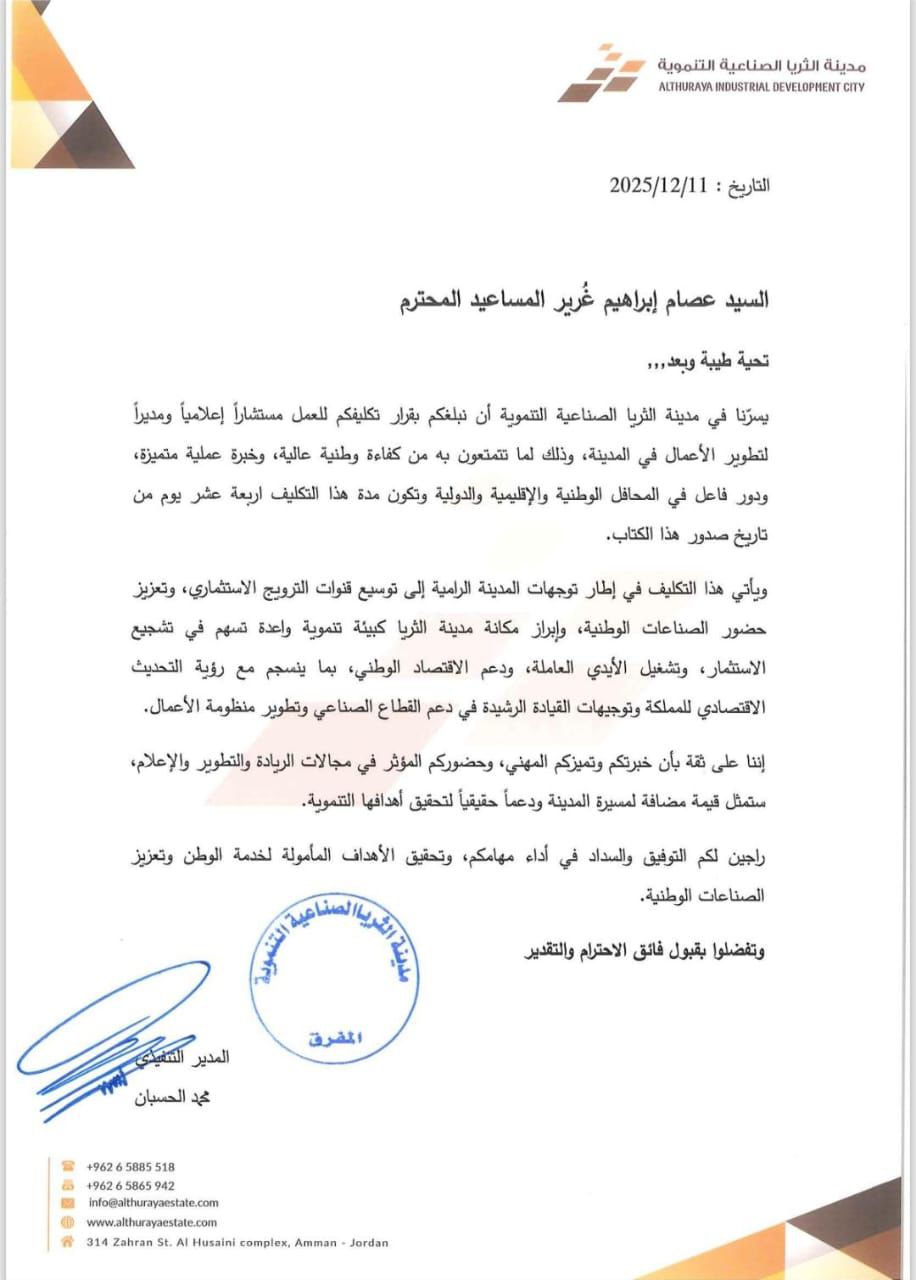 أعلنت مدينة الثريا الصناعية التنموية عن تكليف الأستاذ عصام المساعيد بمهام المستشار الإعلامي ومدير تطوير الأعمال اعتبارًا من اليوم، وذلك بقرار رسمي صادر عن الإدارة التنفيذية للمدينة، تقديرًا لمسيرته المهنية وخبرته الواسعة وحضوره الفاعل في المحافل الوطنية والإقليمية والدولية.