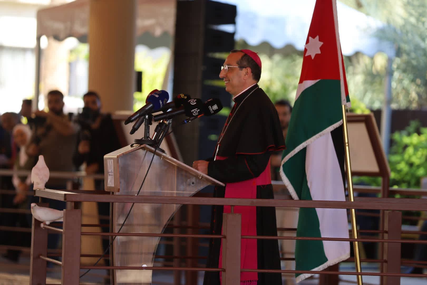 بدوره، أعرب النائب البطريركي للاتين في الأردن المطران إياد طوال عن أن حدث اليوم يحمل دلالات هامة تعكس مكانة الأردن بوصفه مهدًا للحضارات والأديان، مؤكدًا أن الآثار التاريخية المنتشرة في أنحاء المملكة تشهد على جذور هذه الأرض المقدسة التي حملت رسالة محبة وتناغم عبر العصور، وأن الأردن، في ظل القيادة الهاشمية، يمثّل نموذجًا إنسانيًا يحتذى به في التعددية الدينية والثقافية.