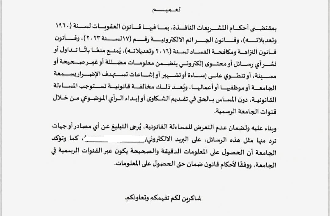 من حيث المبدأ، يعد التعميم وسيلة تنظيمية تهدف إلى ضبط السلوك العام داخل المؤسسات، وتوضيح المرجعيات القانونية، وحماية السمعة المؤسسية من التشويه أو الاستهداف غير القائم على معلومات دقيقة، وفي زمن تتسارع فيه الأخبار وسهولة الحصول على المعلومات، وتنتشر فيه الشائعات بسرعة تفوق قدرة المؤسسات على الرد، يصبح التعميم بمثابة رسالة تأكيد على أن هناك قوانين ناظمة، وأن القنوات الرسمية هي المصدر الأوثق للمعلومة، كما أنه يعكس حرص الإدارة على حماية العاملين والطلبة من الوقوع في مخالفات قانونية قد تترتب عليها مساءلات غير محسوبة او عقوبات .