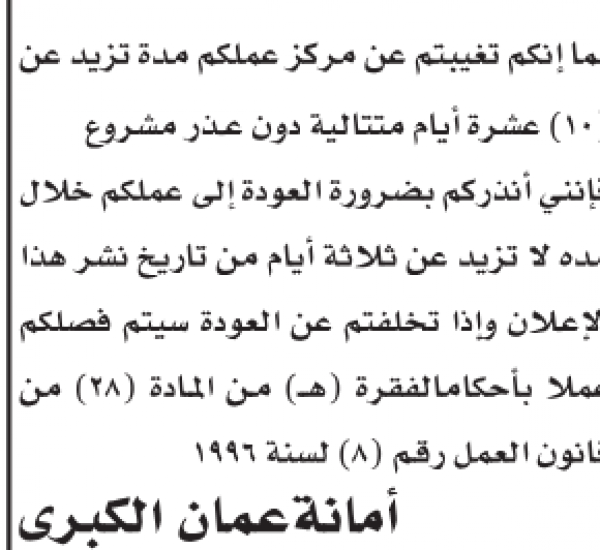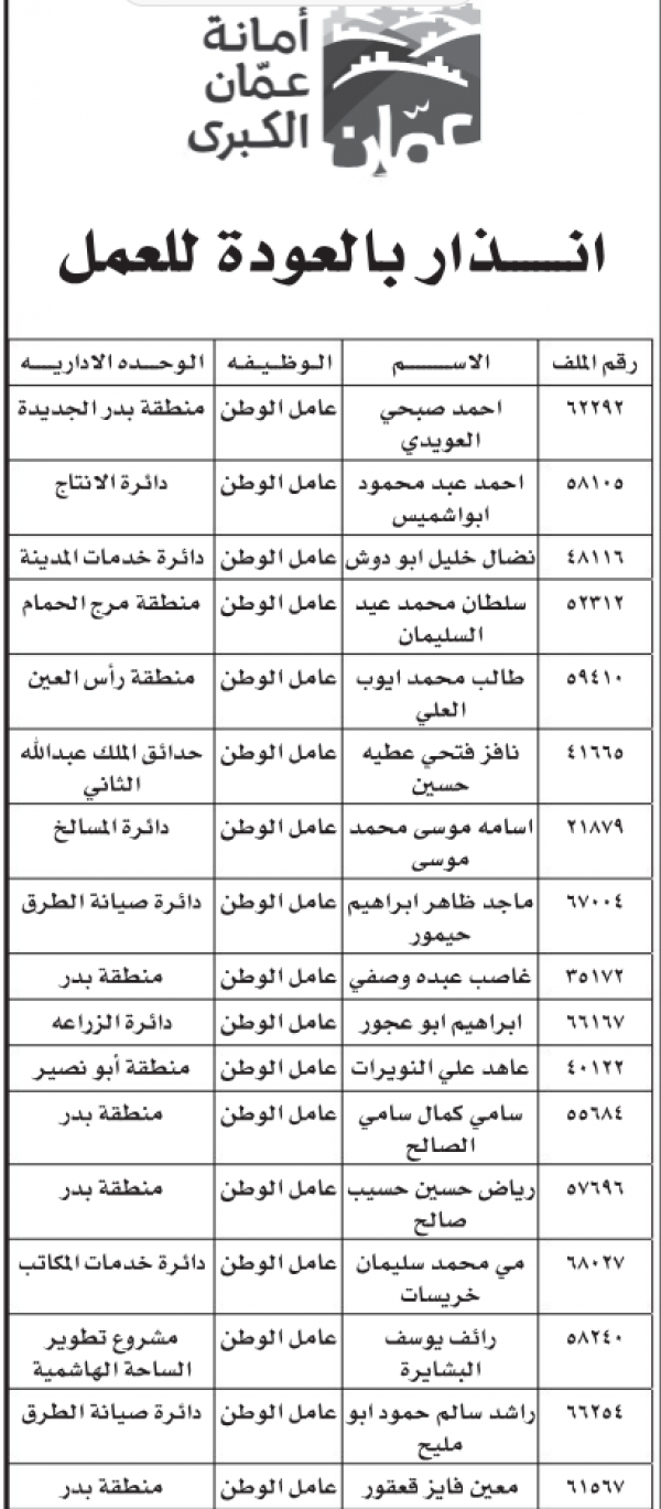 : أنذرت أمانة عمان الكبرى عددًا من عمال الوطن بضرورة العودة إلى عملهم خلال مدة لا تتجاوز 3 أيام، والا تعرضوا للفصل.