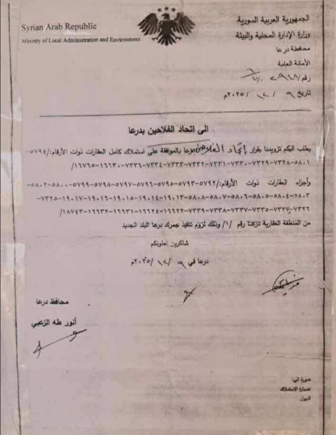 وجّه محافظ درعا، أنور الزعبي، كتاباً رسمياً إلى اتحاد الفلاحين في المحافظة، يطلب فيه الموافقة على استملاك كامل العقارات الواردة أرقامها ضمن المنطقة العقارية (نمر/1)، وذلك بهدف تنفيذ مشروع معبر حدودي جديد مع الأردن.