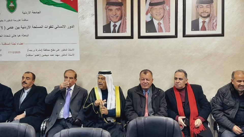 وترأست لجنة المناقشة معالي الدكتور علي محافظة، وضمّت في عضويتها كلًا من معالي الأستاذ الدكتور مهند مبيضين، وسعادة الدكتور إبراهيم الشرعه، وسعادة الدكتور جبر الخطيب.