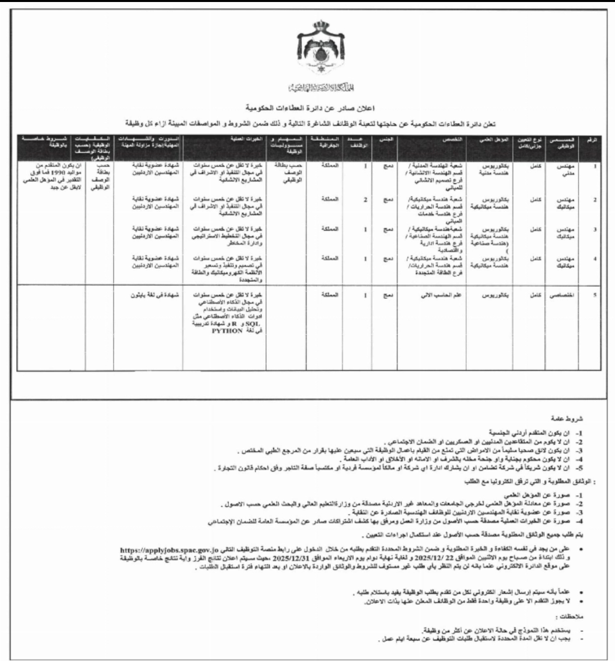 اعلنت دائرة العطاءات الحكومية عن حاجتها لتعبئة الوظائف الشاغرة التالية وذلك ضمن الشروط والمواصفات المبينة ازاء كل وظيفة :