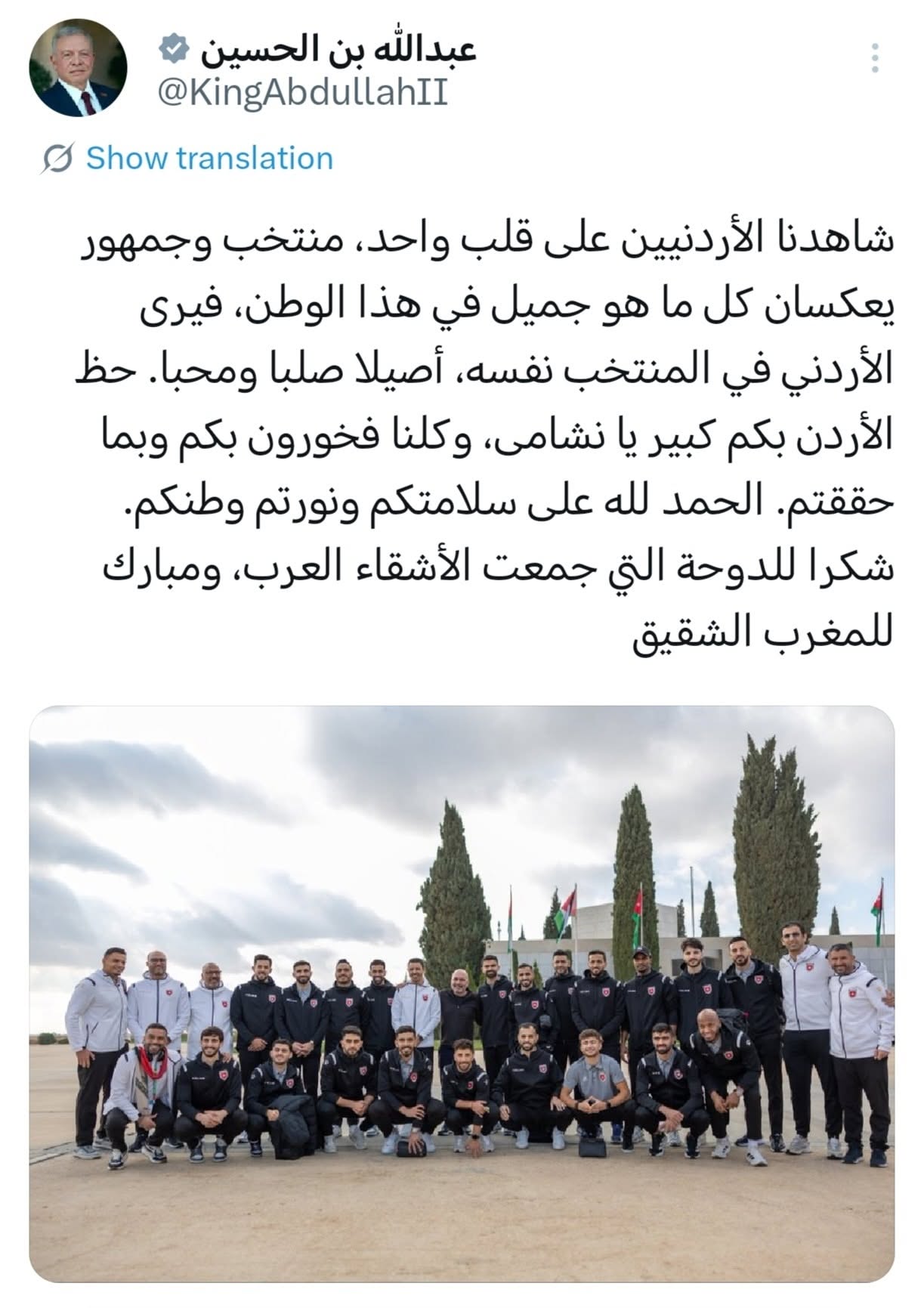 «شاهدنا الأردنيين على قلبٍ واحد، منتخبًا وجمهورًا يعكسان كل ما هو جميل في هذا الوطن، فيرى الأردني في المنتخب نفسه، أصيلًا صلبًا ومحبًا. حظّ الأردن بكم كبير يا نشامى، وكلنا فخورون بكم وبما حققتم. الحمد لله على سلامتكم ونوّرتم وطنكم».