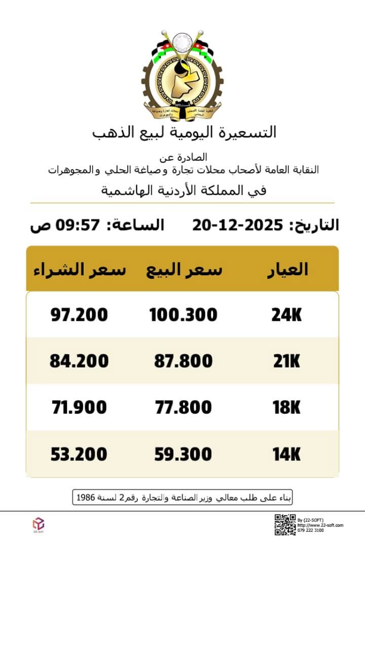 وعلى صعيد العيارات الأخرى المتداولة في السوق، سجل سعر بيع الغرام من عيار 24 الأنقى ذهبا قيمة بلغت 100.300 دينار، مقابل 97.200 دينار لسعر الشراء.