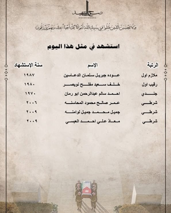 يظل صرح الشهيد شاهدًا خالدًا على عظمة التضحيات التي قدمها أبناء الأردن، الذين ارتقوا دفاعًا عن الوطن وحماية لترابه الطهور. هذا الصرح ليس مجرد بناء حجري، بل هو رمز للعزة والكرامة وذاكرة وطنية تحفظ أسماء الرجال الذين رووا الأرض بدمائهم الزكية.