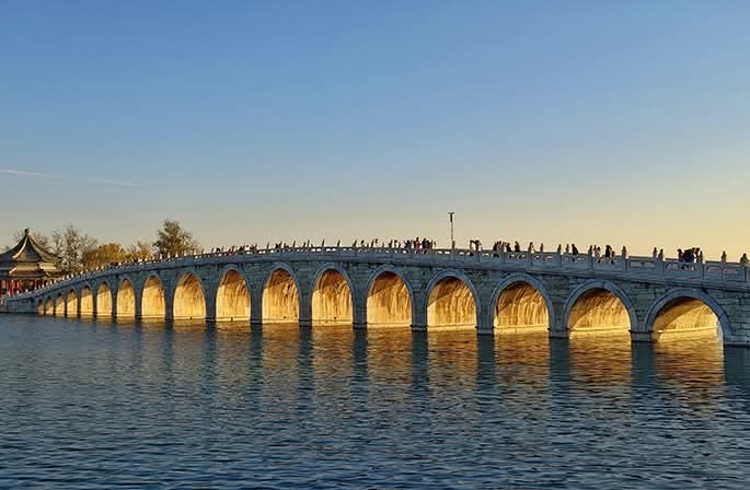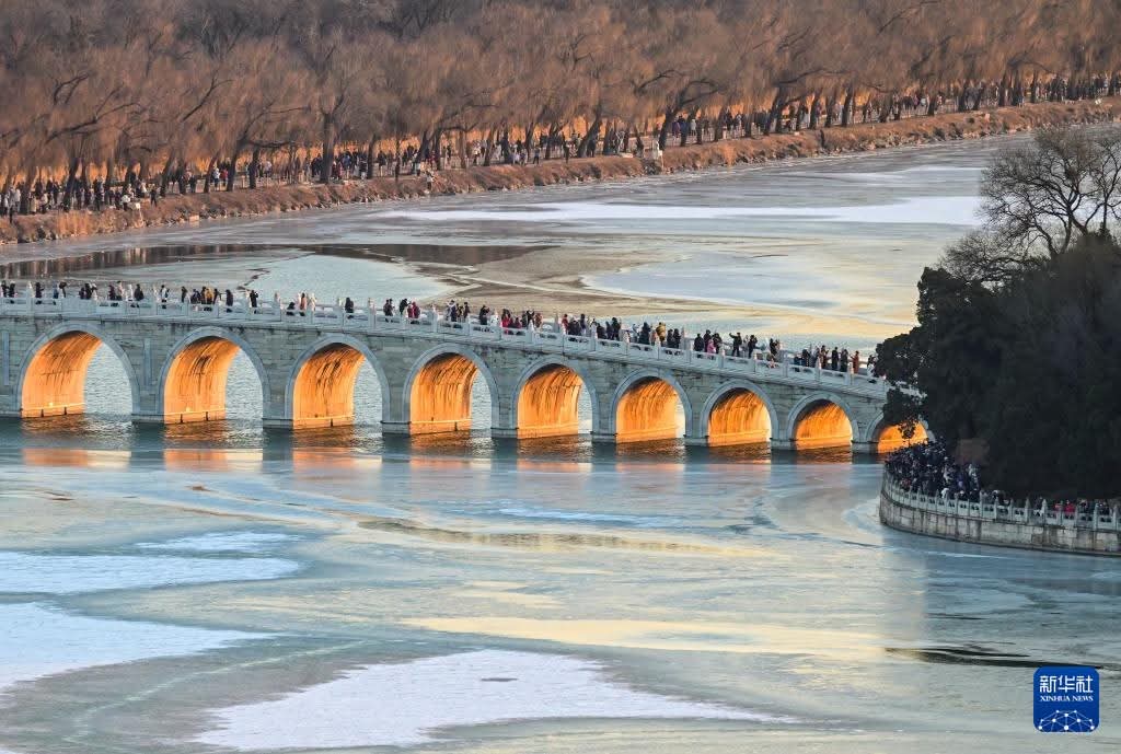 ظهر القصر الصيفي غرب العاصمة بكين مؤخرا في مشهد ساحر، حيث تسللت أشعة الشمس الذهبية عبر جسور الأقواس السبعة عشر، وأضائتها بألوانها المبهرة.