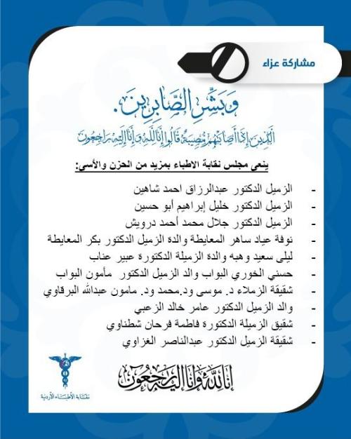 كما أعرب مجلس نقابة الأطباء عن تعازيه بوفاة عدد من ذوي الهيئة العامة، داعيا الله عز وجل أن يتغمدهم بواسع رحمته، ويلهم ذويهم الصبر والسلوان.