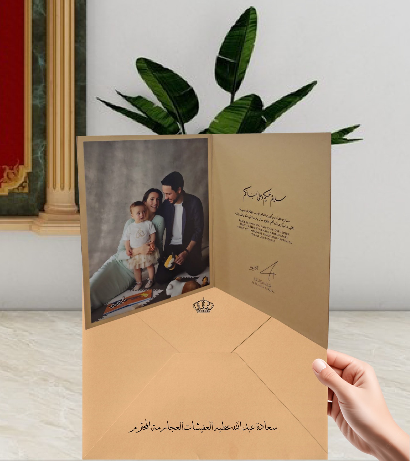 و تاليا بطاقة التهنئة التي وصلت السيد عبد الله عطية العفيشات العجارمة من صاحب السمو الملكي الامير الحسين بن عبد الله ولي العهد وسمو الاميرة رجوة الحسين بمناسبة العام الجديد :