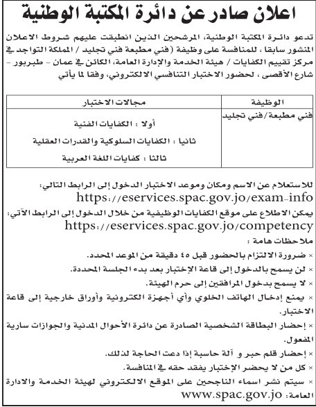 المكتبة الوطنية تعلن عن حاجتها لتعيين فني مطبعة وفني تجليد