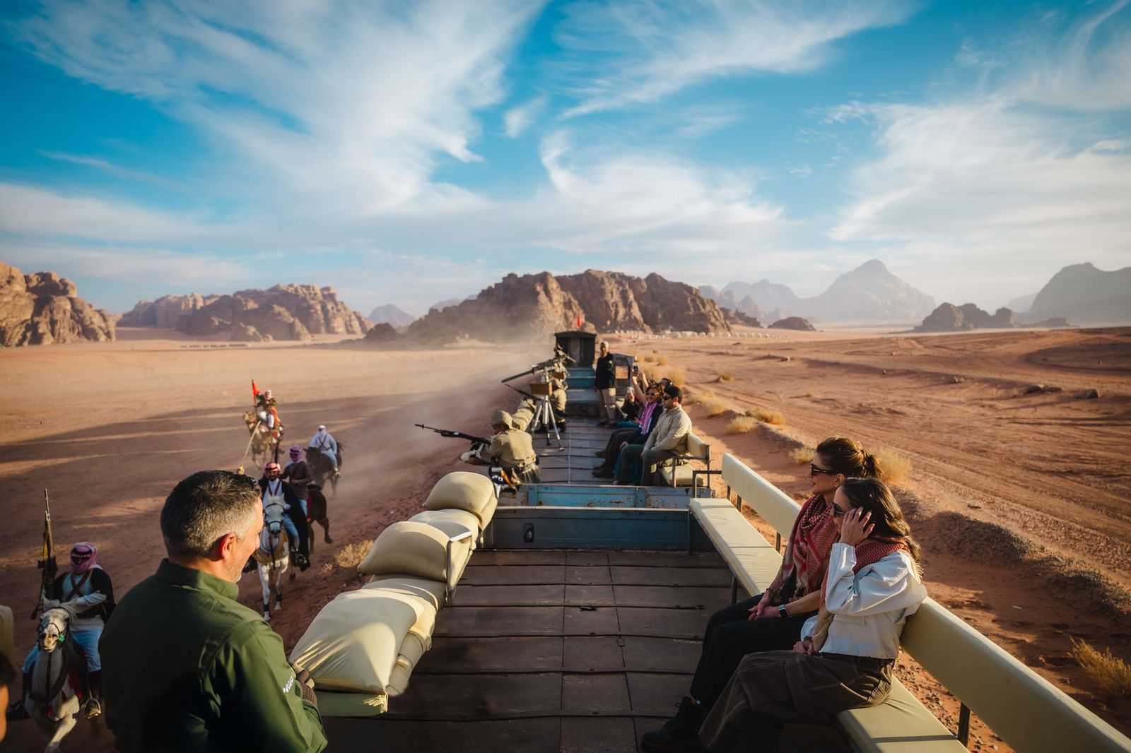 وكانت جلالتها والأميرة سلمى قد بدأتا جولتهما في وادي رم برحلة قصيرة على متن قطار الثورة العربية الكبرى، واستمعتا إلى نبذة عن عمل الشركة الأردنية لإحياء التراث من قبل الرئيس التنفيذي للشركة مؤيد أبو رمان الذي أشار إلى أن رحلة القطار تمثل تجربة مميزة، حيث يعيش الزائر رحلة عبر الزمن بالعودة لعام 1916 تحاكي مشاهداً من بعض أحداث الثورة العربية الكبرى
