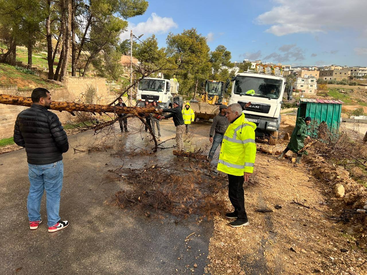تدخلت كوادر غرفة الطوارئ في منطقة ديرالليات التابعة لبلدية جرش الكبرى على الفور بعد ورود بلاغ إلى الغرفة يفيد  بسقوط شجرة معمرة على أحدا أعمدة الكهرباء في منطقة دير الليات (طريق المقام بالقرب من المقبره).