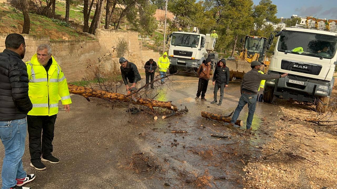 جرش ..كوادر الطوارئ في منطقة ديرالليات تتدخل فورا بعد سقوط شجرة معمرة على أحدا أعمدة الكهرباء
