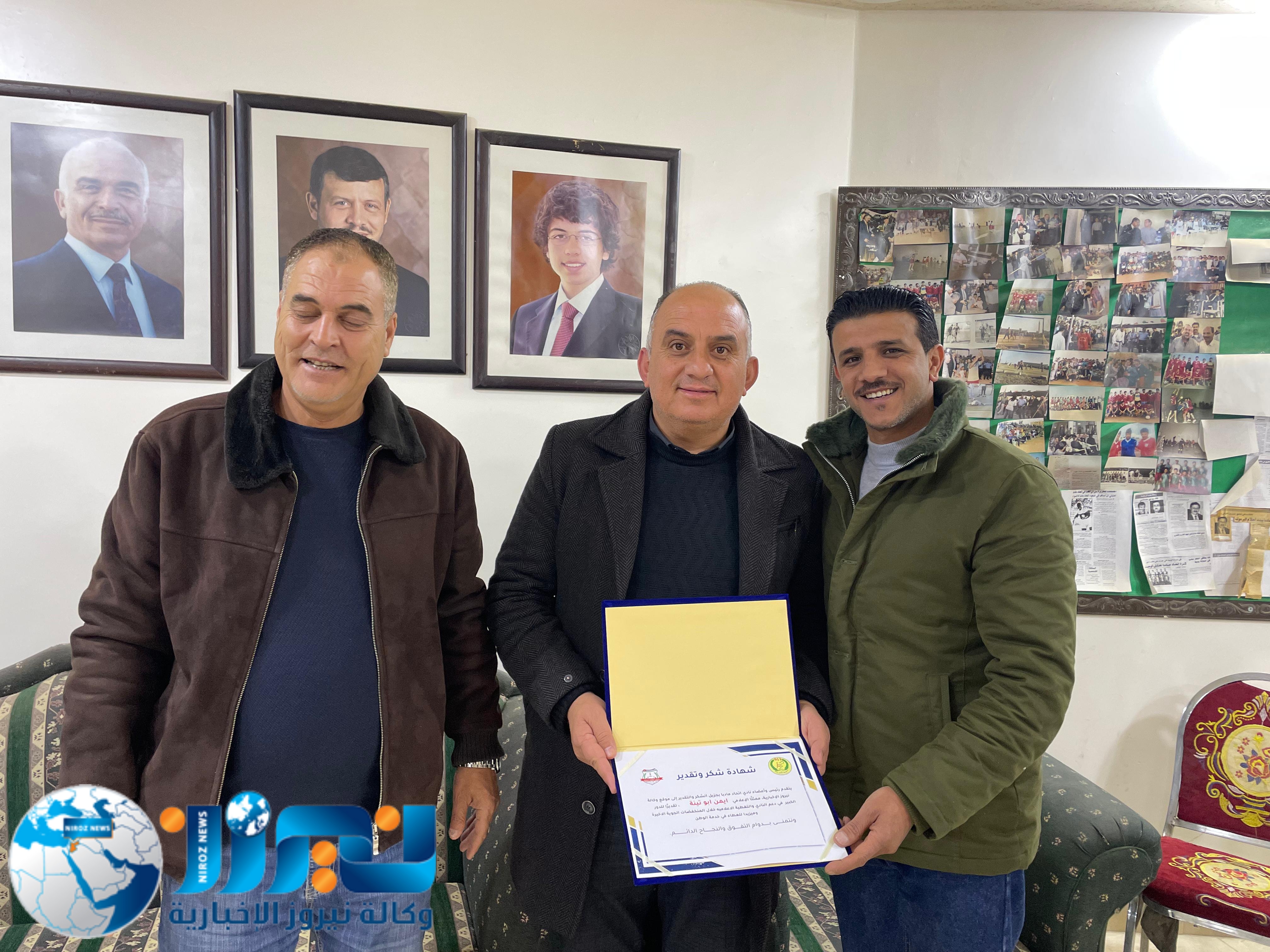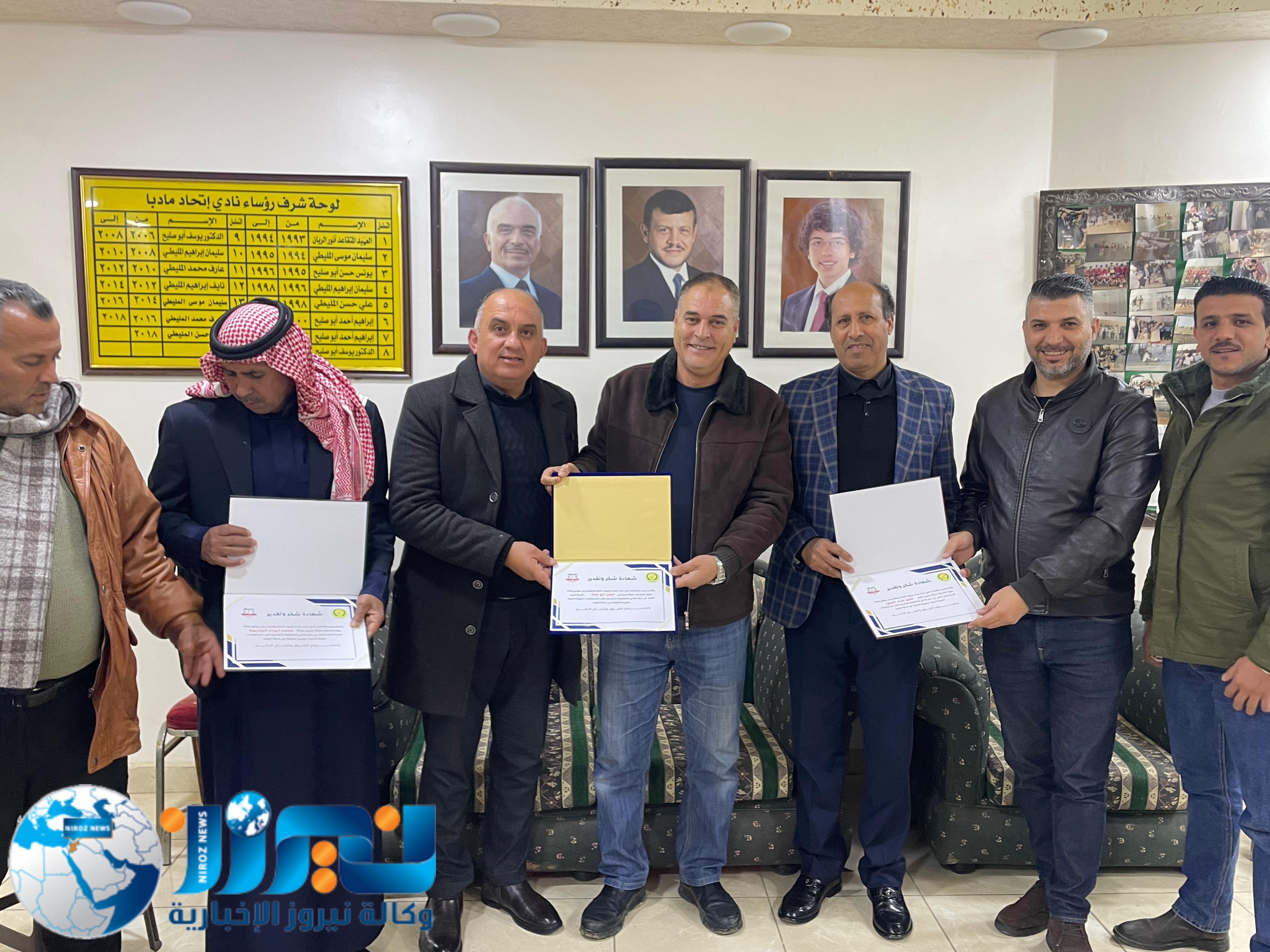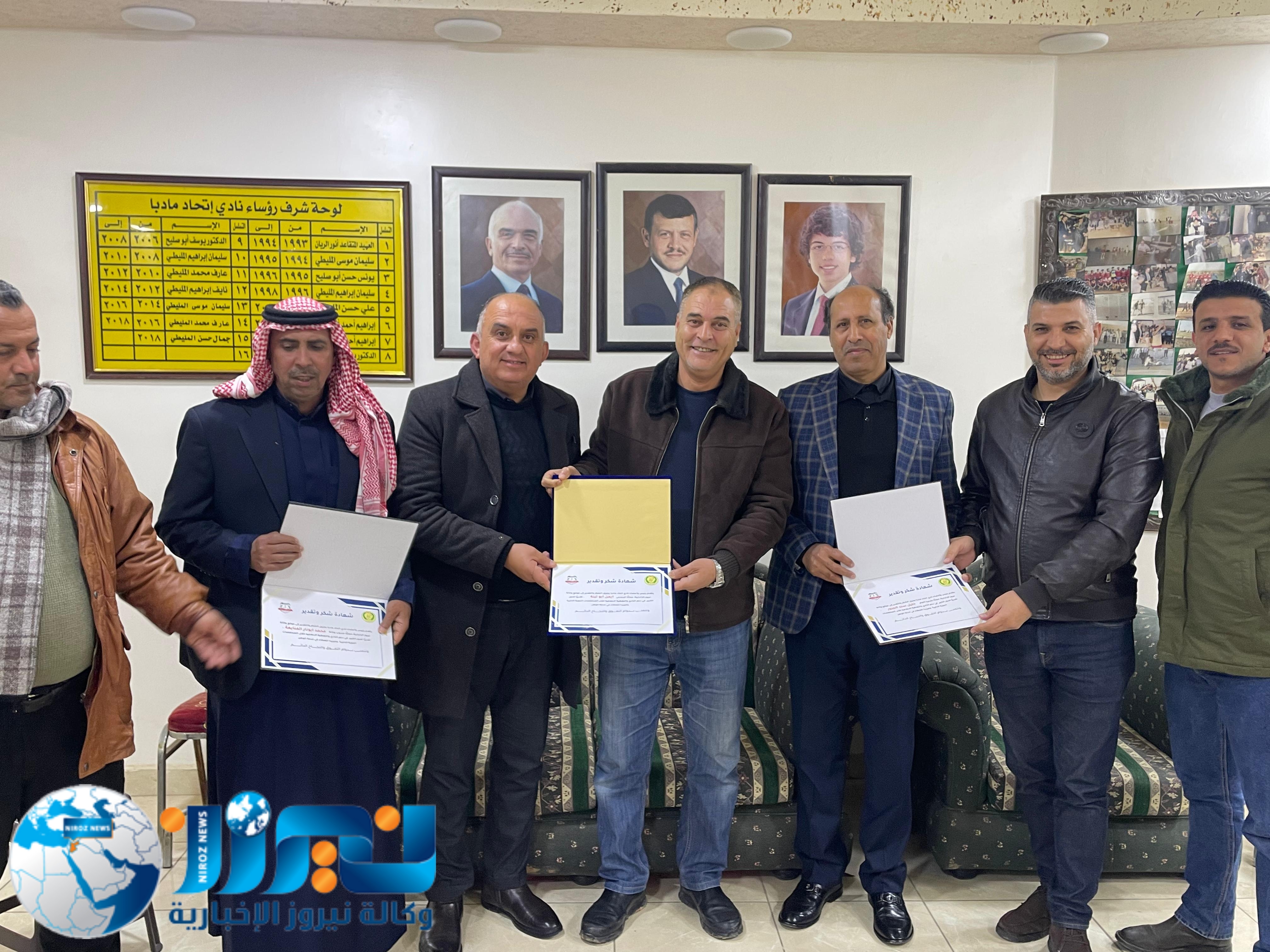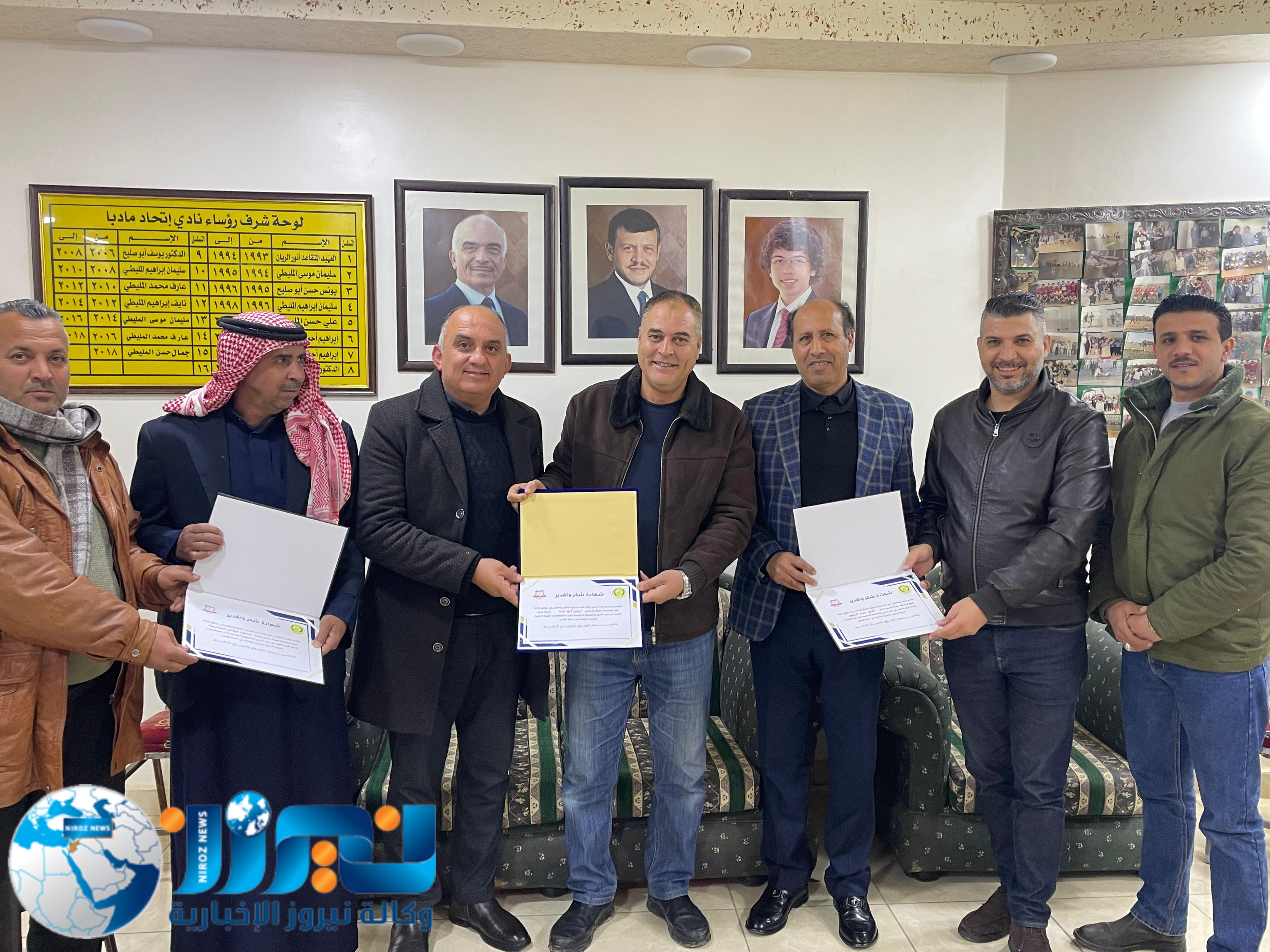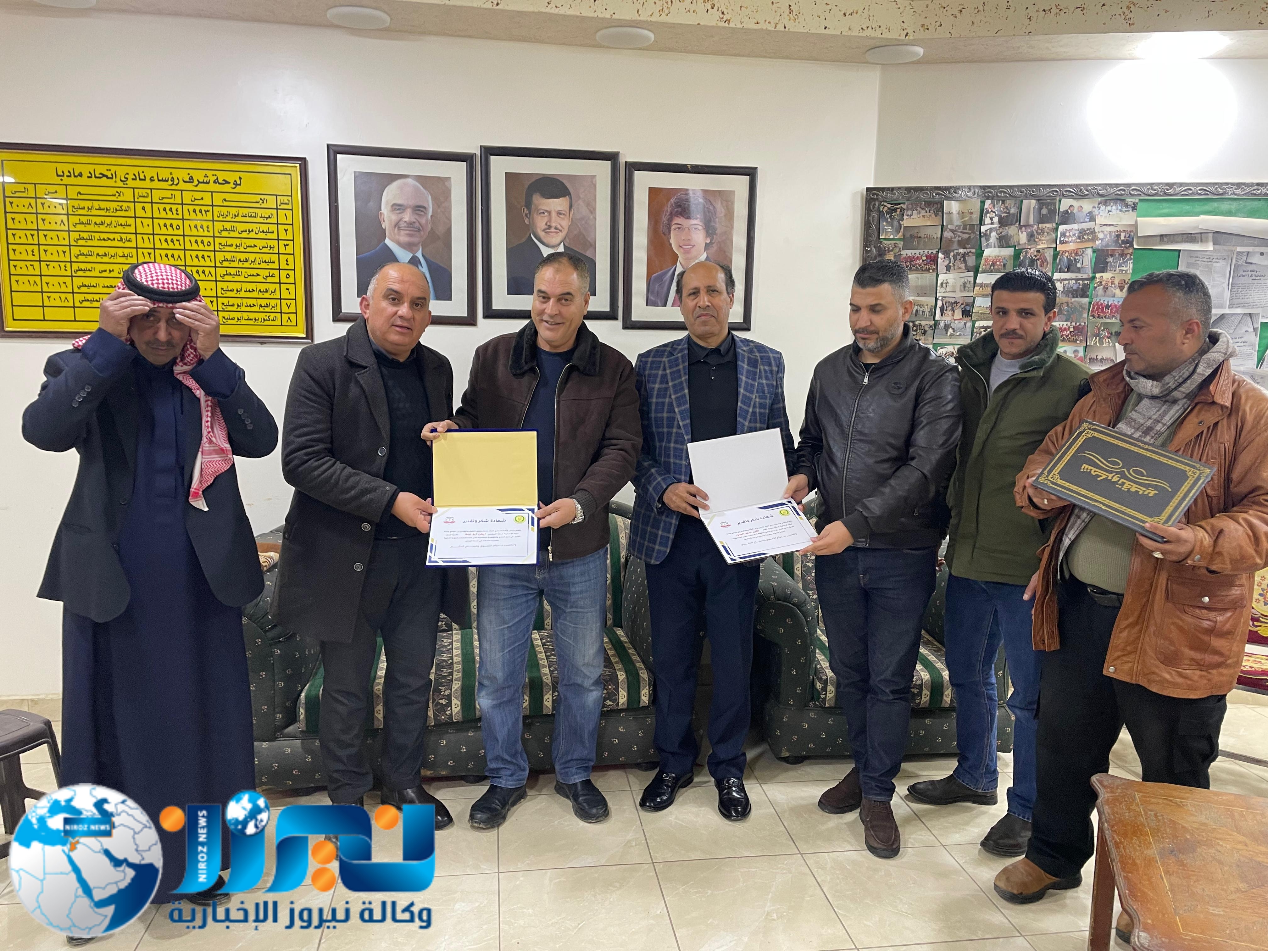كرّم جمال المليطي، الرئيس الفخري لنادي اتحاد مادبا ومؤسس فريق أهل العزم للدفع الرباعي، ورئيس النادي وليد المليطي، وكالة نيروز الإخبارية ممثلة بالمدير العام الأستاذ خليل سند الجبور، وعضو الوكالة محمد أبو نار، وذلك خلال حفل أُقيم اليوم في مقر النادي بحضور عدد من الأعضاء.