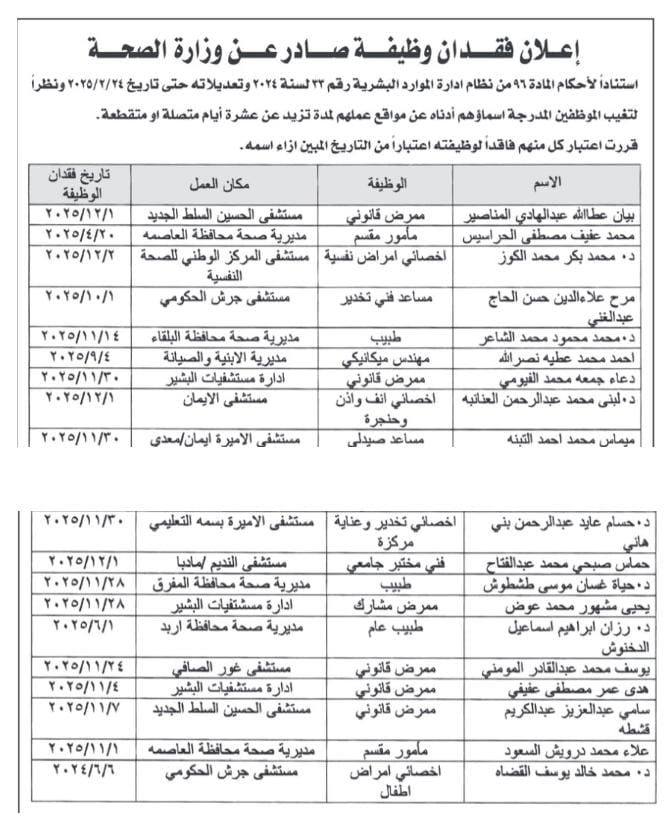 قررت وزارة الصحة اعتبار الموظفين المدرجة أسماؤهم أدناه فاقدين لوظائفهم، وذلك بسبب تغيبهم عن مواقع عملهم لمدة تزيد على عشرة أيام متواصلة أو متقطعة، استنادًا إلى أحكام المادة (96) من نظام إدارة الموارد البشرية رقم (33) لسنة 2024 وتعديلاته.