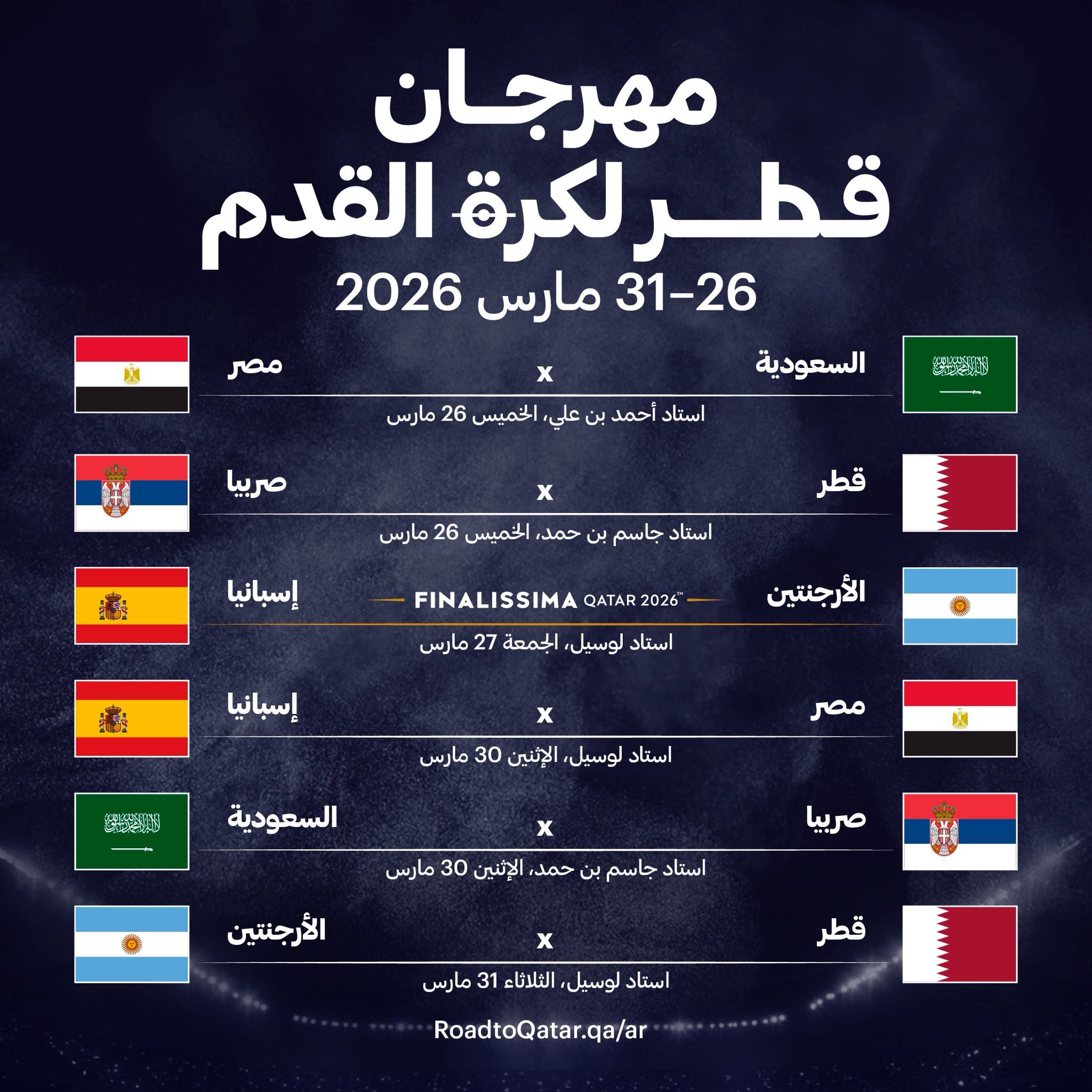 الدوحة، دولة قطر ـــ أعلنت اللجنة المحلية المنظمة لأحداث كرة القدم عن مهرجان قطر لكرة القدم 2026 الذي سيعقد خلال الفترة من 26 إلى 31 مارس. وسيضم المهرجان مباراة كأس فيناليسيما 2026، إلى جانب عدد من المباريات الدولية التي تجمع نخبة من المنتخبات استعدادًا لمشاركتها في بطولة كأس العالم 2026™️، بما يتيح لها الوقوف على جاهزيتها الفنية والتنافسية قبل انطلاق الحدث العالمي المرتقب.