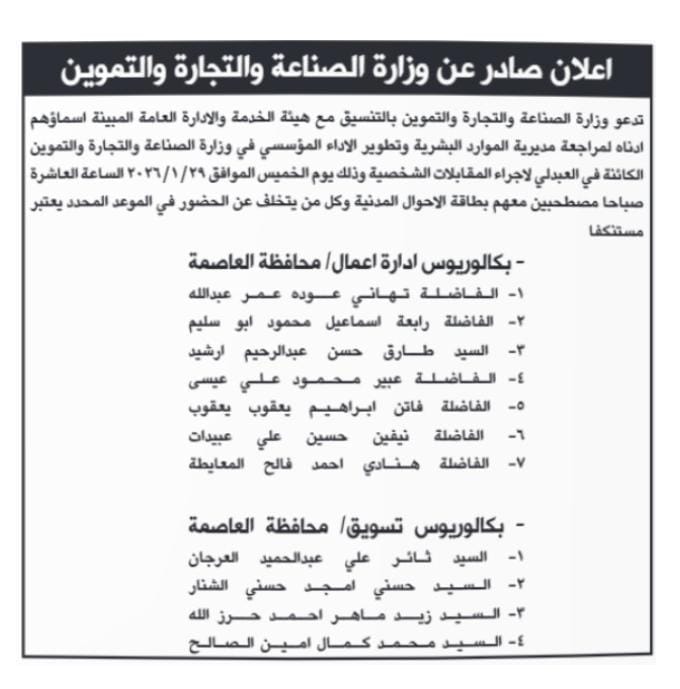 دعت وزارة الصناعة والتجارة والتموين، اليوم الخميس، التالية أسماؤهم لاجراء المقابلة الشخصية.