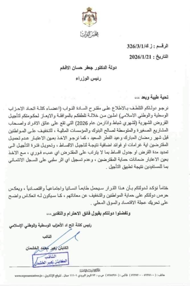 وجّه رئيس كتلة اتحاد الأحزاب الوسطية والوطني الإسلامي  النيابية النائب الكابتن زهير الخشمان كتابًا رسميًا إلى دولة رئيس الوزراء الدكتور جعفر حسان، طالب فيه بتأجيل الأقساط الشهرية المترتبة على المواطنين خلال شهري شباط وآذار من عام 2026.