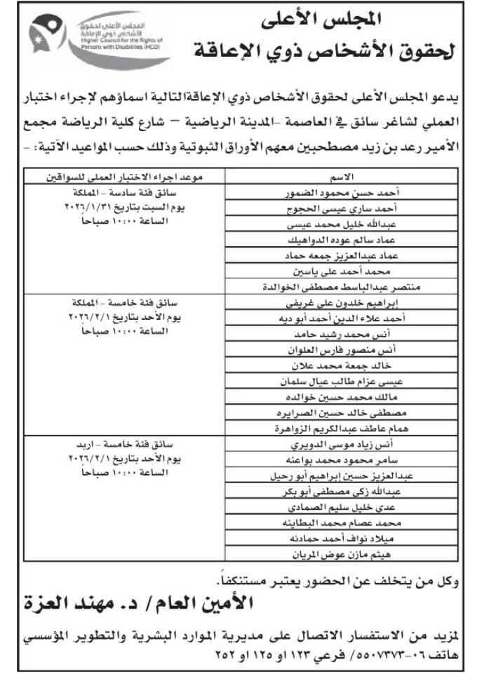 يدعو المجلس الأعلى لحقوق الأشخاص ذوي الاعاقة، اليوم الاثنين التالية أسماؤهم لإجراء الاختبار العملي.
