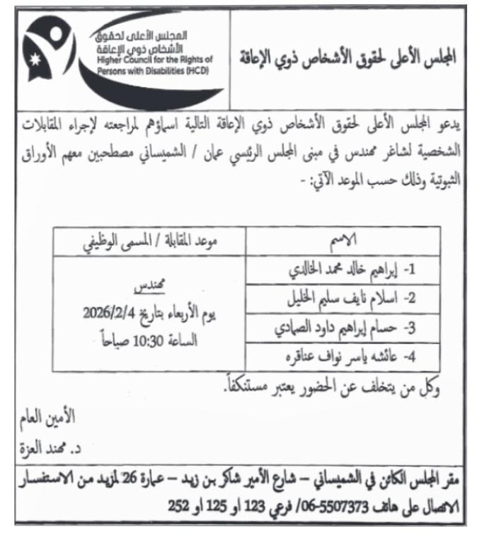 يدعو المجلس الاعلى لحقوق الاشخاص ذوي الاعاقة التالية اسماؤهم لاجراء المقابلات الشخصية.