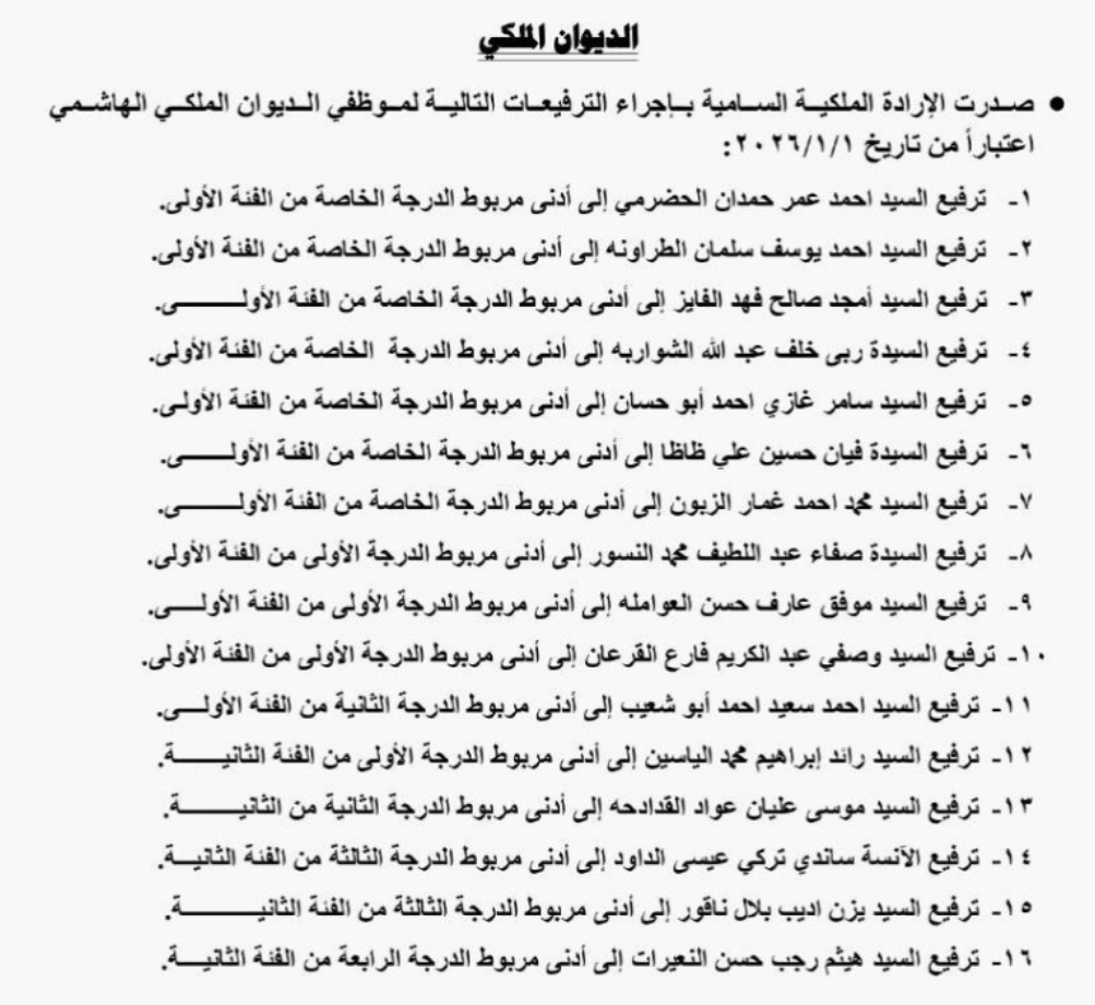 صدر في عدد الجريدة الرسمية اليوم الخميس، الإرادة الملكية السامية بترفيع 16 موظفا من موظفي الديوان الملكي الهاشمي، اعتبارا من 1-1-2026.