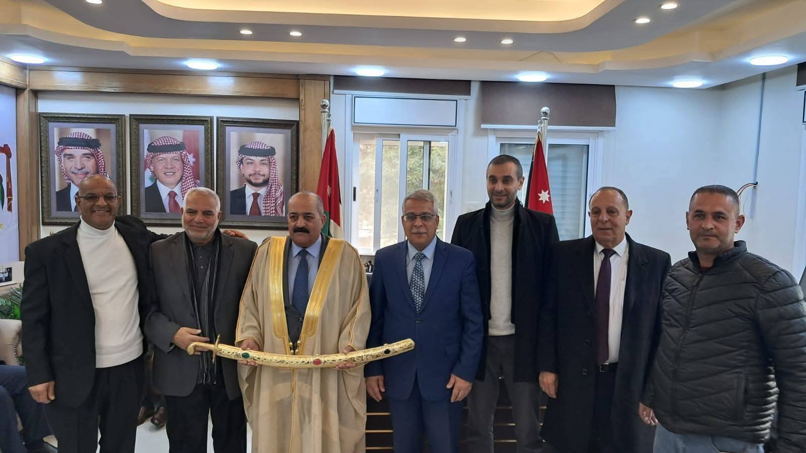 يرافقه موظفو البلدية، عطوفة المحافظ، . فيما قدمت غرفة تجارة إربد برئاسة السيد محمد