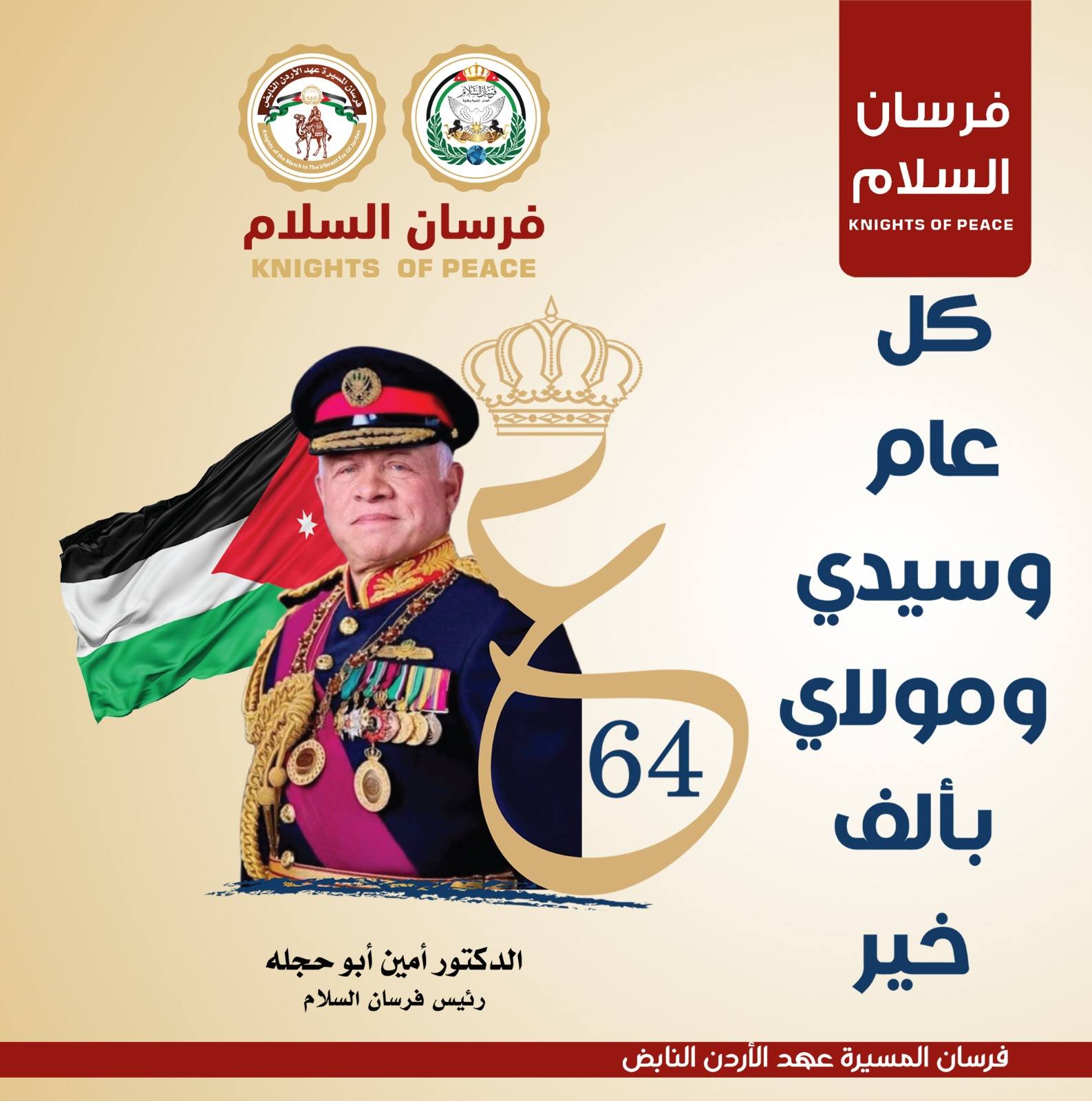 السلام، أسمى آيات التهنئة والتبريك إلى مقام حضرة صاحب الجلالة الهاشمية الملك عبدالله