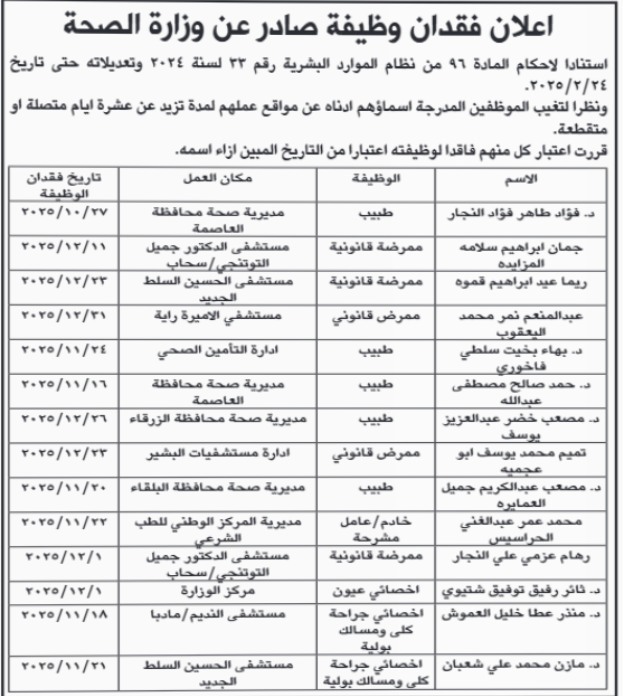 نيروز الإخبارية : أعلنت وزارة الصحة عن فقدان عدد من موظفيها لوظائفهم، وفق أحكام المادة (96) من نظام إدارة الموارد البشرية رقم (33) لسنة 2024 وتعديلاته، حتى تاريخ 24 فبراير 2025.