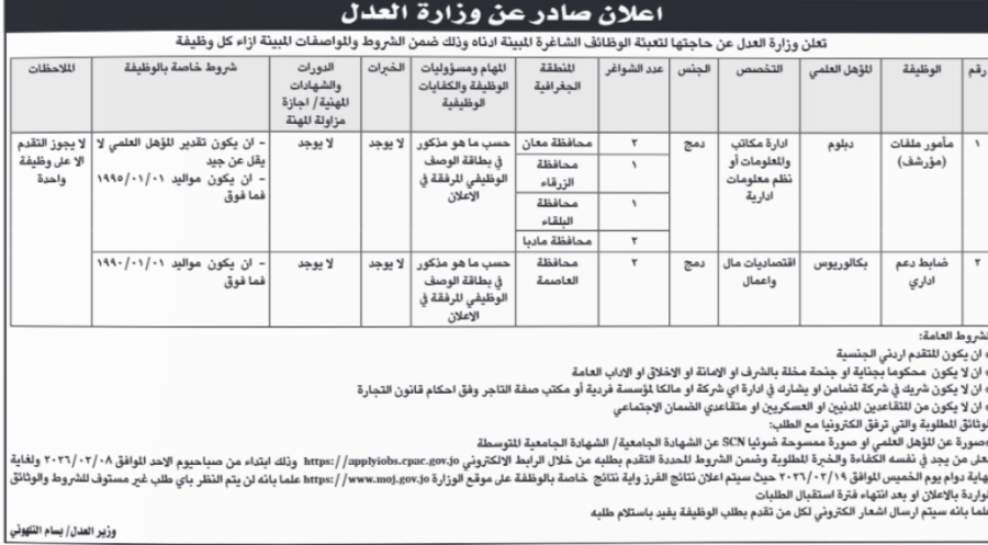 وزارة العدل تعلن عن حاجتها لتعبئة وظائف شاغرة