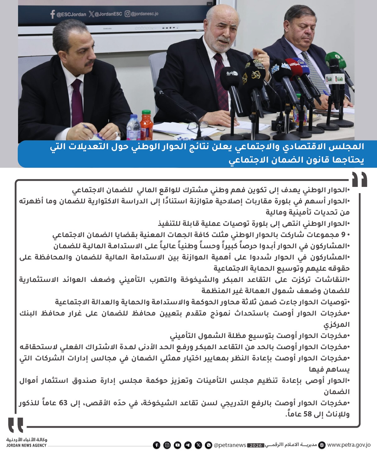 أعلن المجلس الاقتصادي والاجتماعي اليوم الأربعاء، نتائج الحوار الوطني حول ما يحتاجه قانون الضمان الاجتماعي من تعديلات في ضوء نتائج الدراسة الاكتوارية الحادية عشرة التي كشفت عن نتائجها المؤسسة العامة للضمان الاجتماعي أخيرا والتي تقيم المركز المالي لها واستمرار استدامتها التأمينية على المدى الطويل.