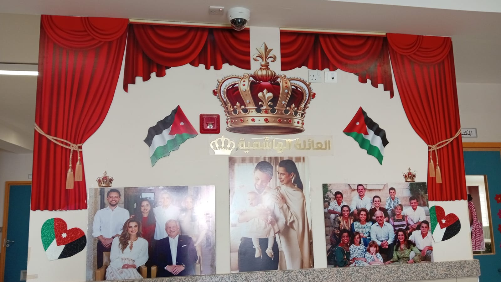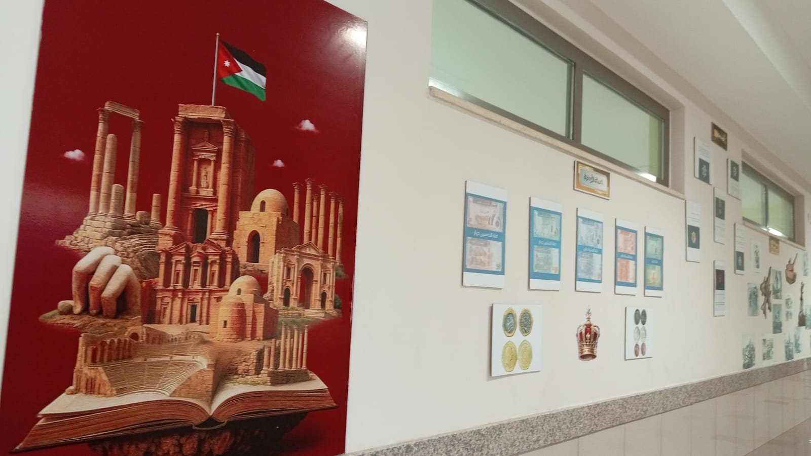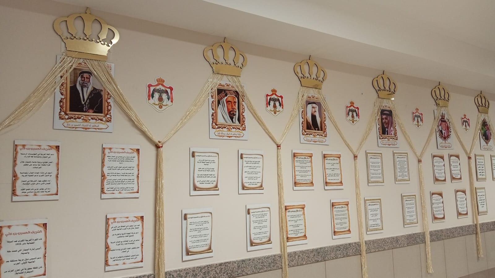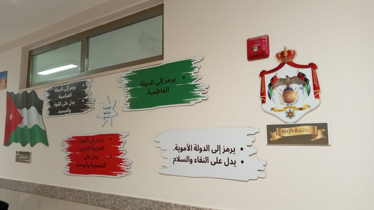 وتم تنفيذ المعرض في أحد الممرات الداخلية للمدرسة، مستغلة المكان بشكل مبتكر لعرض محتوى يبرز قيم الولاء والانتماء للقيادة الهاشمية.
