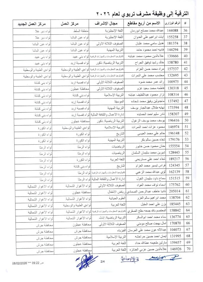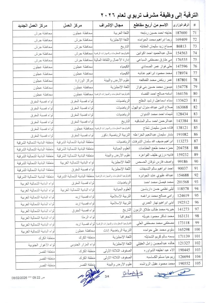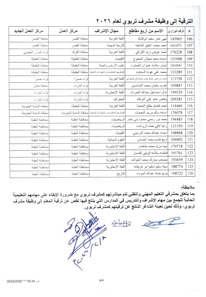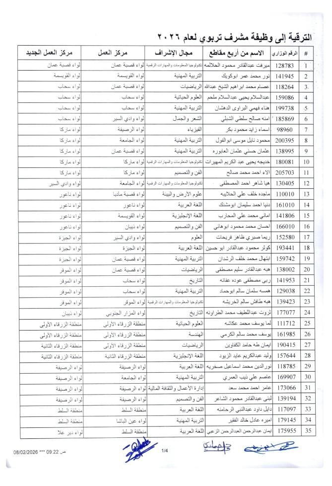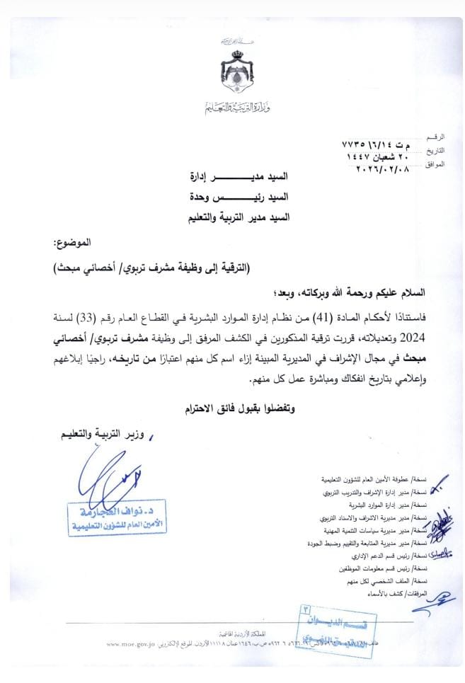 قرر وزير التربية والتعليم ترقية المذكورين في الكشف المرفق أدناه إلى وظيفة مشرف تربوي / أخصائي مبحث في مجال الإشراف والمديرية المبيّنة إزاء اسم كلّ منهم اعتبارا من تاريخه.