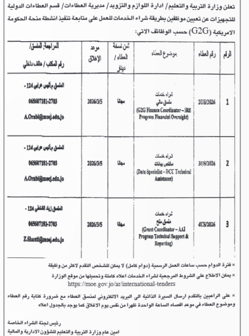 أعلنت وزارة التربية والتعليم عن رغبتها في شراء دمات موظفين لشغل مواقع شاغرة في وظائف مختلفة.